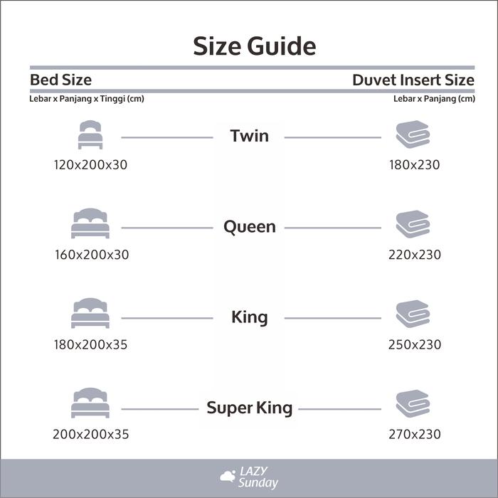 King - 250x230, Queen - 220x230, Super King - 270x230, Twin - 180x230