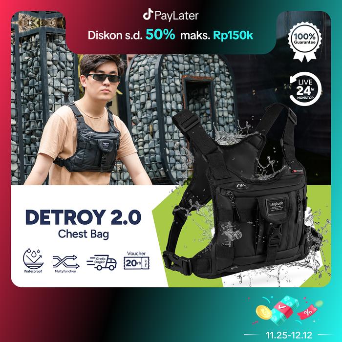 Chest Bag DETROY 2.0 Waterproof Anti Air Tas Dada Outdoor Tactical Rig Bag Terbaru Pria Pinggang Waistbag Cowo - hitam