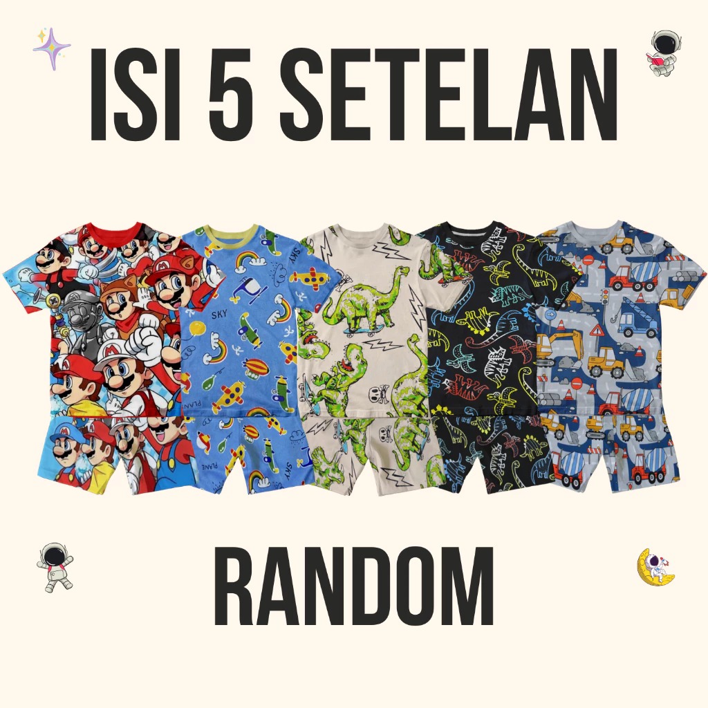 Setelan anak - Paket 5 pcs Baju Setelan Karakter Random Full Print / Set Baju Anak Cowok Laki Laki Ukuran S - XXL - FP