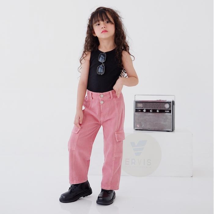 ERVIS CELANA CARGO KANCING UNISEX JEANS ANAK BAHAN DENIM 2-8 TAHUN SIMPLE PAS BAWAHAN PEREMPUAN KIDS - CARGO PINK, SZ M