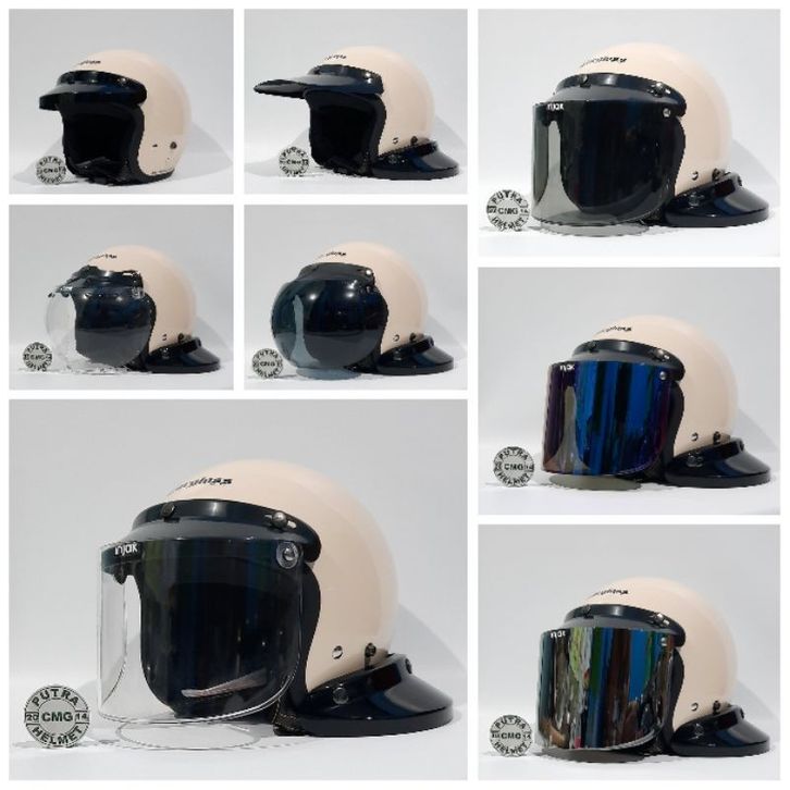 Helm pet panjang, Helm pet pendek, Kaca cembung bening, Kaca cembung hitam, Kaca datar bening, Kaca datar hitam, Kaca datar pelangi, Kaca datar silver