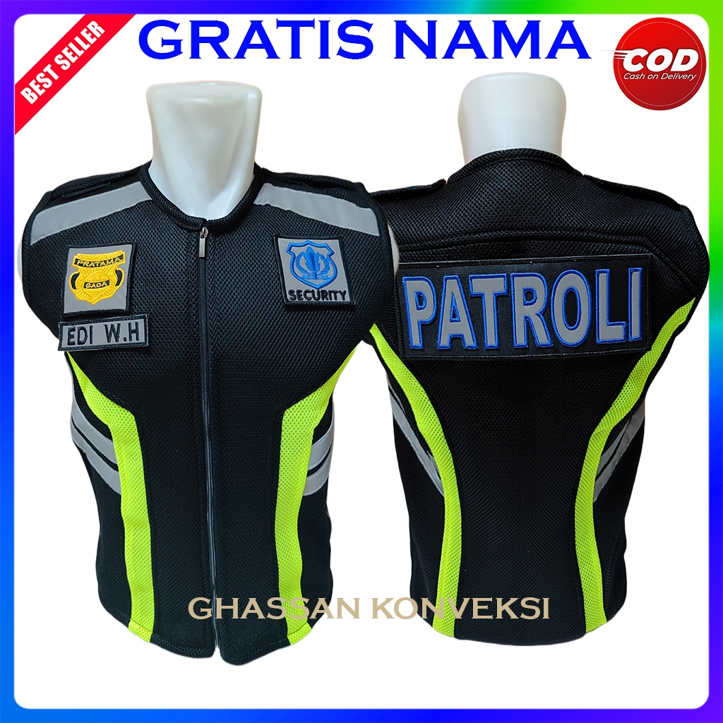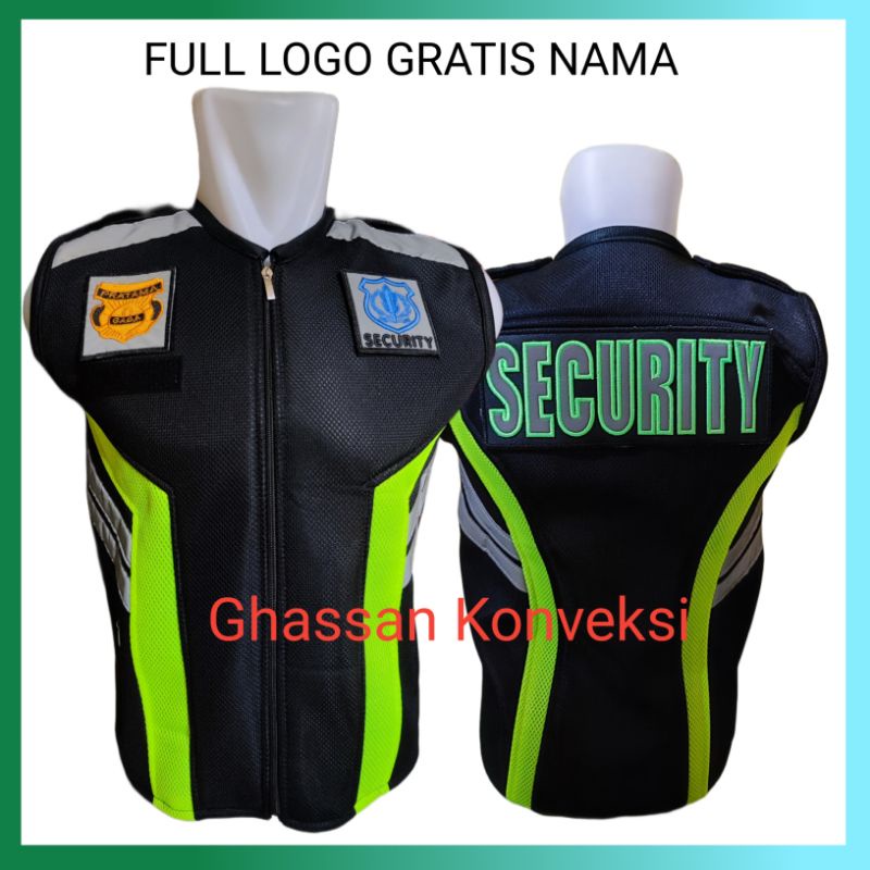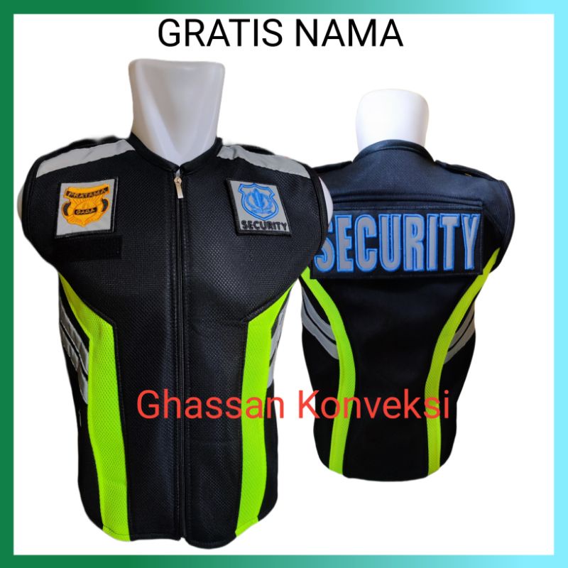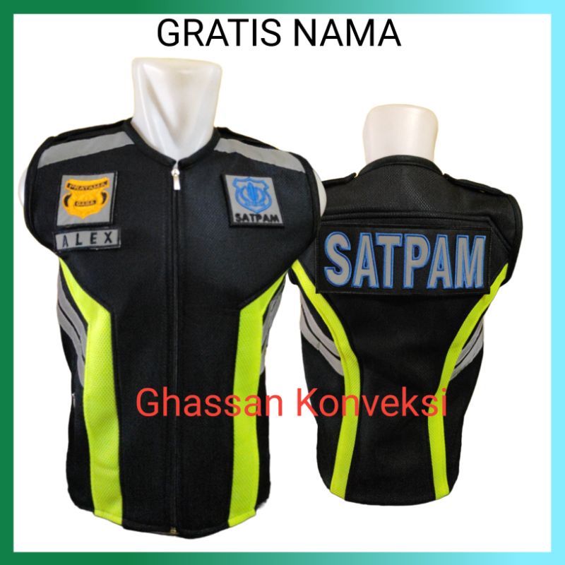 rompi satpam Gratis Nama Rompi Jala Tebal Hitam Plat Hijau Untuk Security Satpam Logo Bordir Terbaru