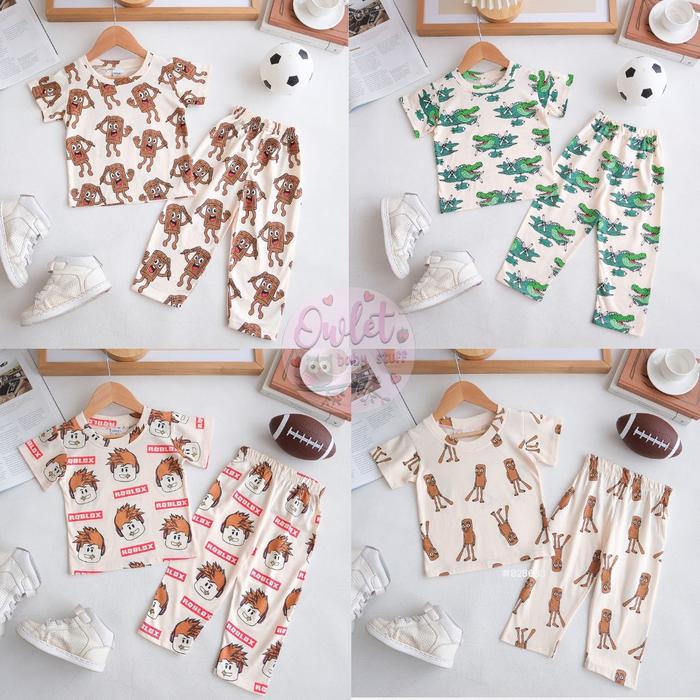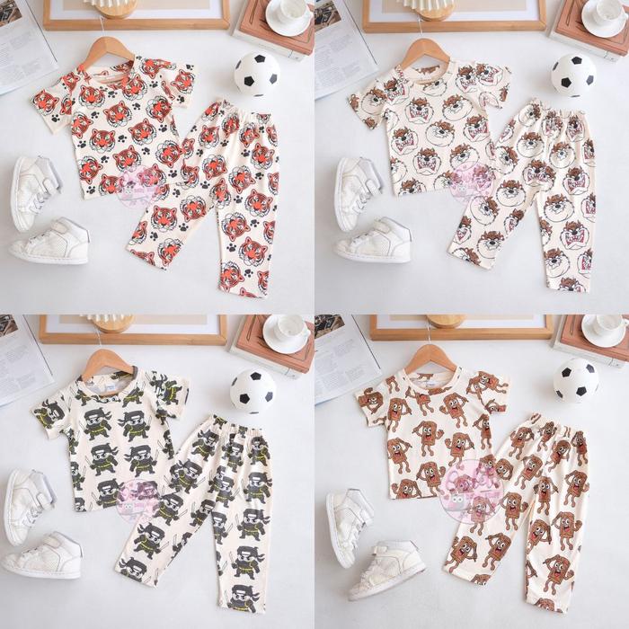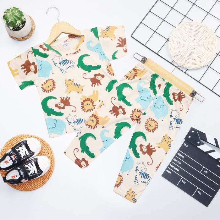 OWLET - SETELAN ANAK LAKI LAKI / PIYAMA ANAK BERGAMBAR / PIYAMA PANJANG / BAJU TIDUR ANAK / SETELAN MOTIF FULL PRINTING 1-7THN LENGAN PENDEK - ANIMALS CREAM PDKPJG, XXL