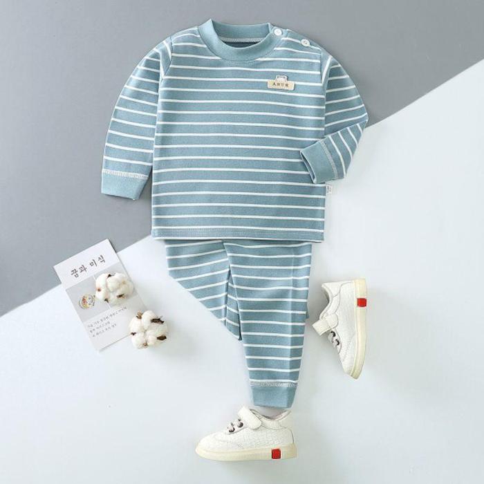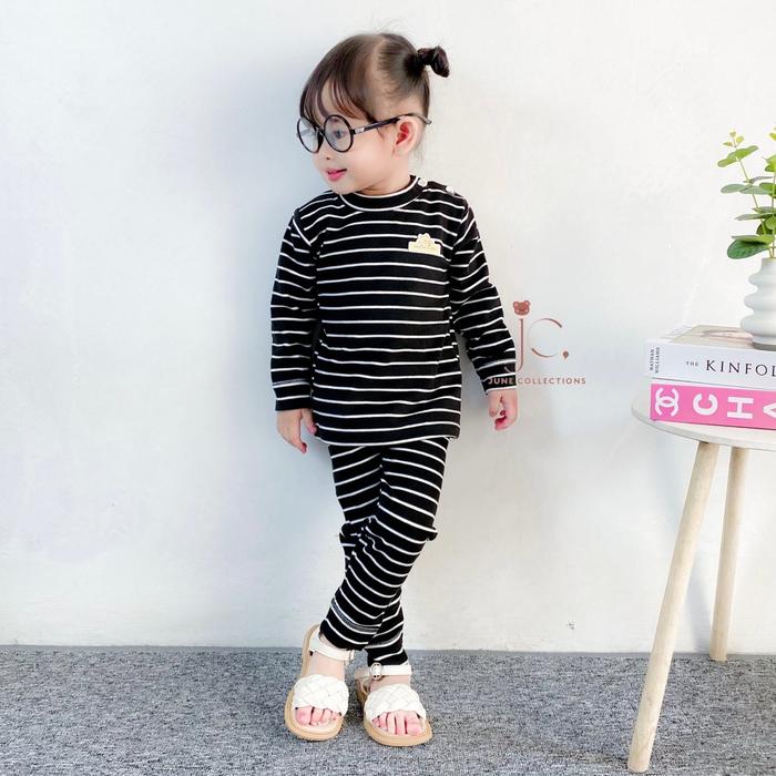 JUNE_COLLECTIONS BAJU TIDUR ANAK SETELAN PIYAMA BAYI SET LENGAN PANJANG PIYAMA ANAK MOTIF SALUR GARIS-GARIS BAHAN LEMBUT #236-242 KATUN UNISEX - #236 GARIS BIRU, 50/73