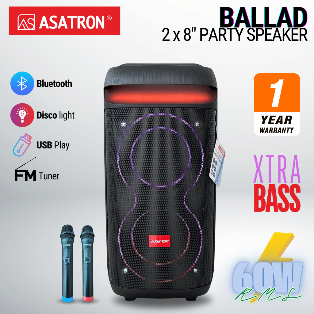 Asatron Ballad Dual 8 Inch Bluetooth Party Speaker with 2 Wireless Mic