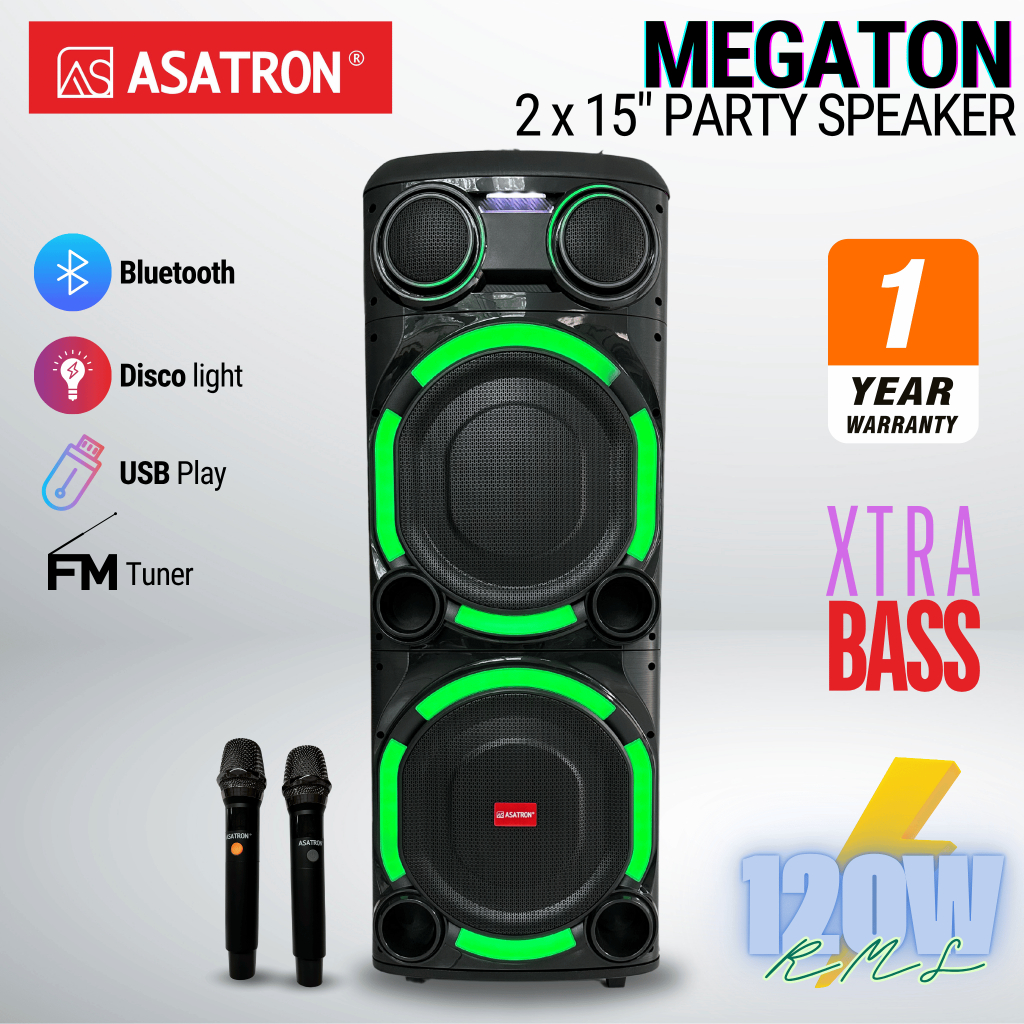 Asatron Megaton Dual 15 Inch Bluetooth Party Speaker with 2 Wireless Mic