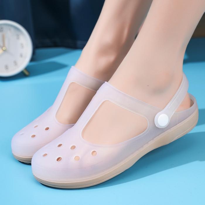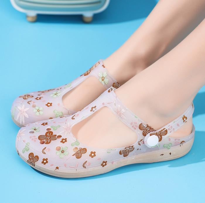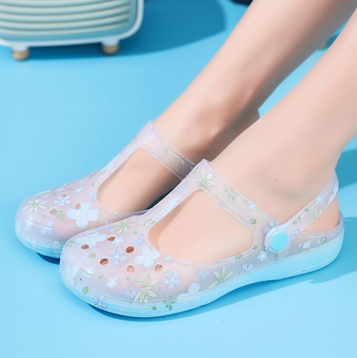 OKAIDO OFFICIAL SANDAL SEPATU WANITA PEREMPUAN SLOP MOTIF BUNGA & POLOS JELLY BENING TRANSPARAN COKLAT KARET PINK SENDAL CEWEK - UNGGU+BUNGA, 36