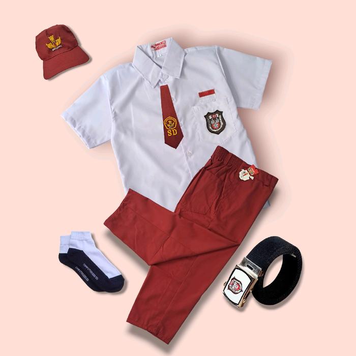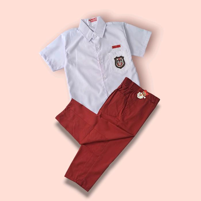 SETELAN SERAGAM SEKOLAH MERAH PUTIH SD ANAK LAKI-LAKI BAJU PUTIH LENGAN PENDEK CELANA MERAH PANJANG - SET LENGKAP TOPI MERAH PUTIH, 7 TAHUN
