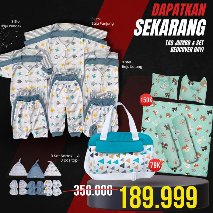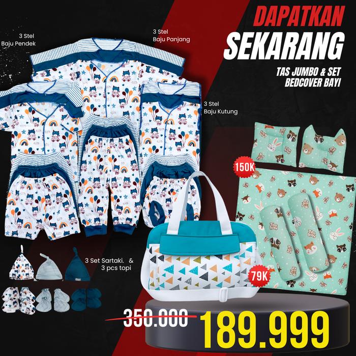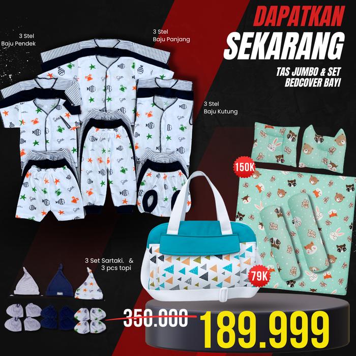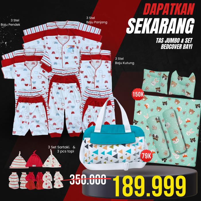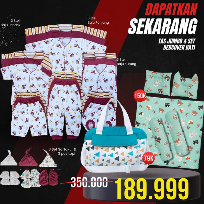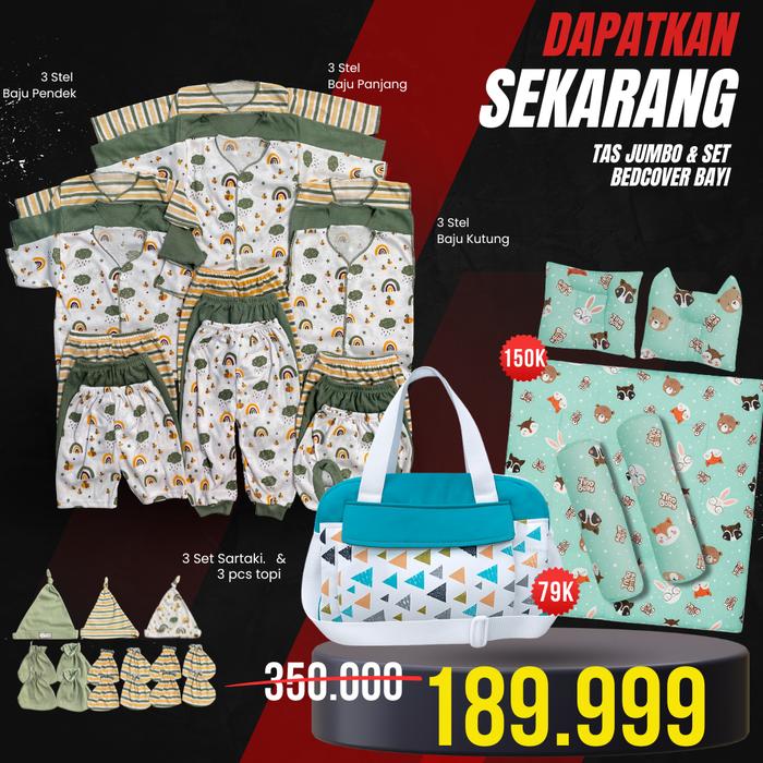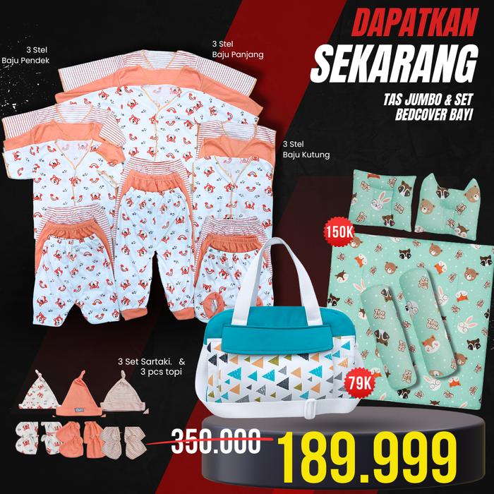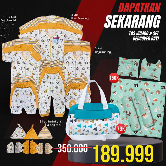 PAKET BEROJOL BEDCOVER - STELAN NEWBORN 18PCS FREE BEDOCVER 2 BANTAL 2 GULING DAN GRANDZ PRIZE DIAPERS JUMBO - BAJU BAYI 0-3 BULAN - MUSTARD BEAR, BEDCOVER + DIAPERS