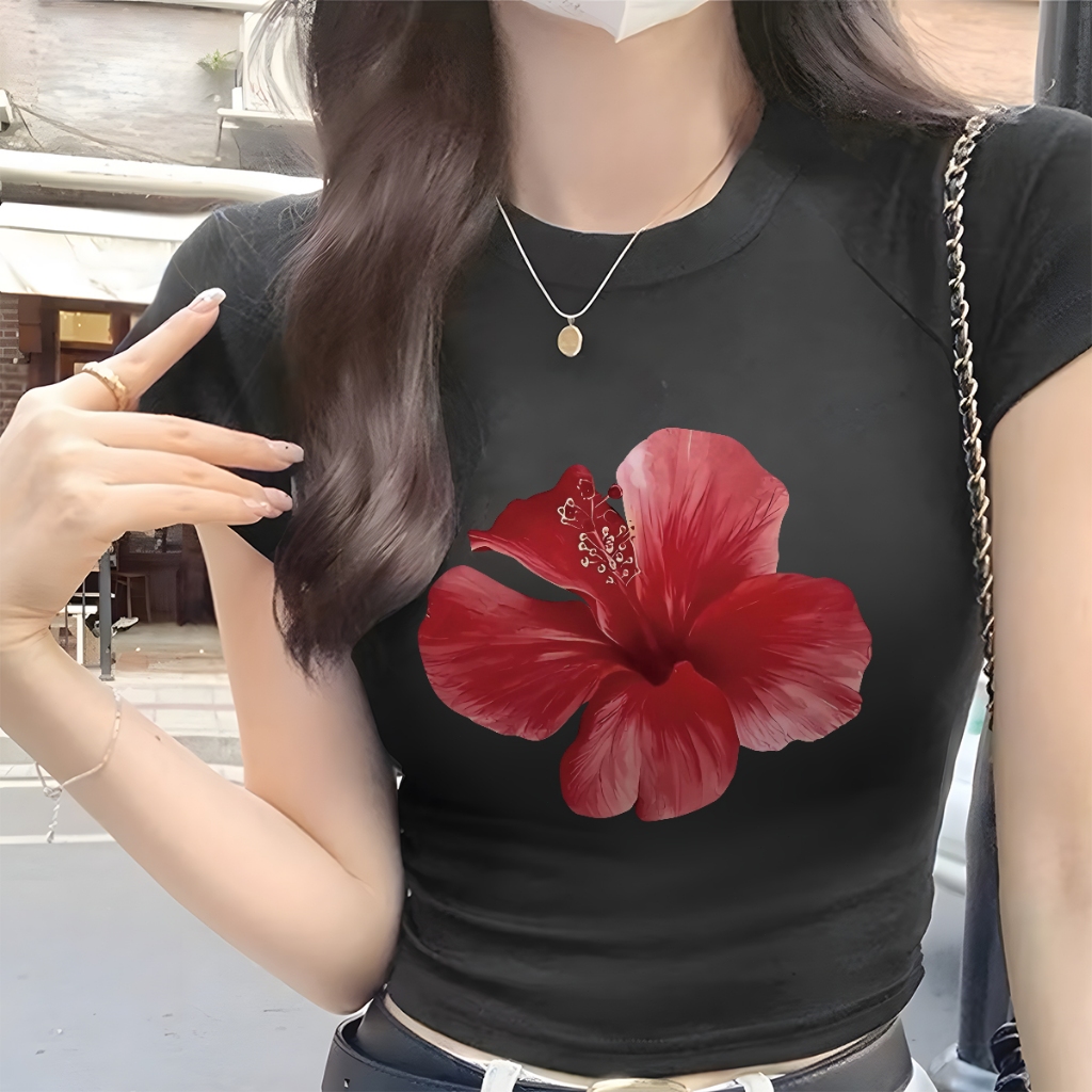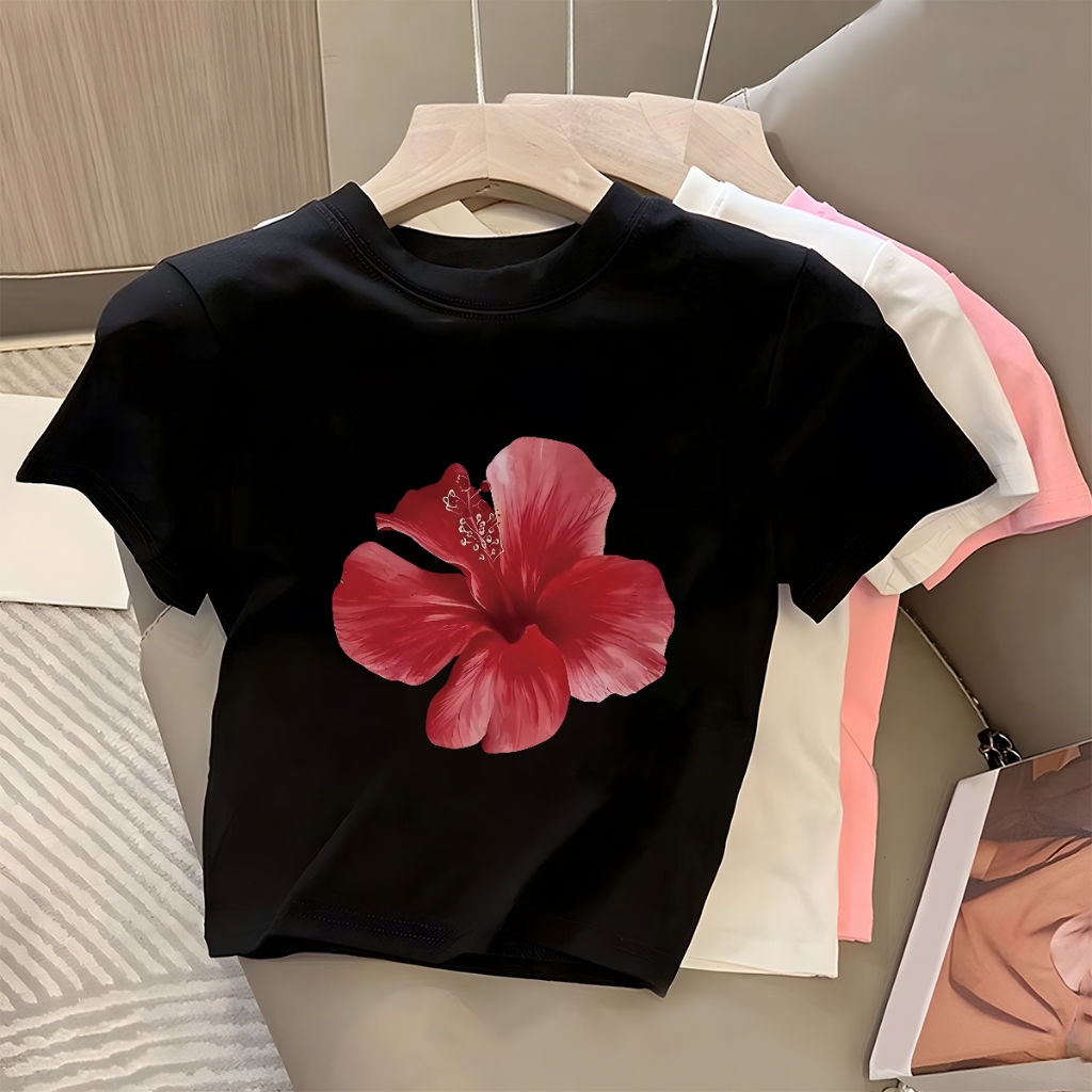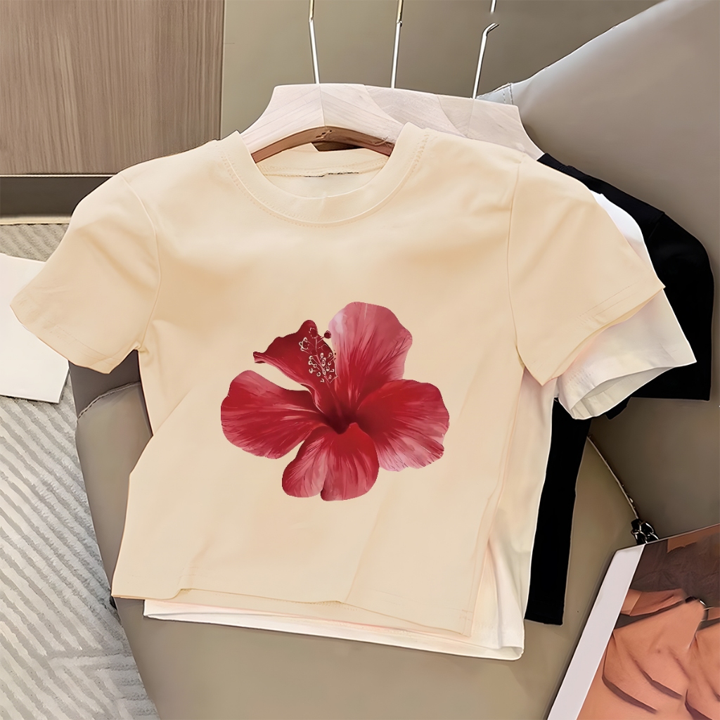 JW T-SHIRT CROP LENGAN PENDEK KAOS WANITA CROP KOREA FLOWERS PRINT KAOS CROP WANITA KEKINIAN BAJU CROP WANITA PUTIH CROP Y2K