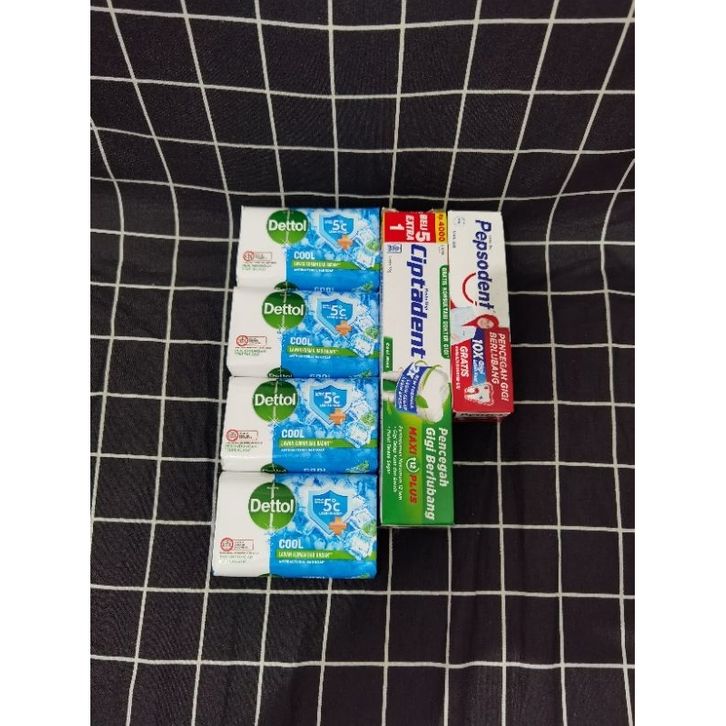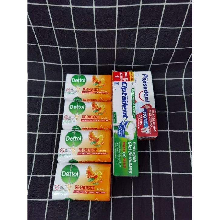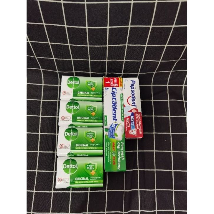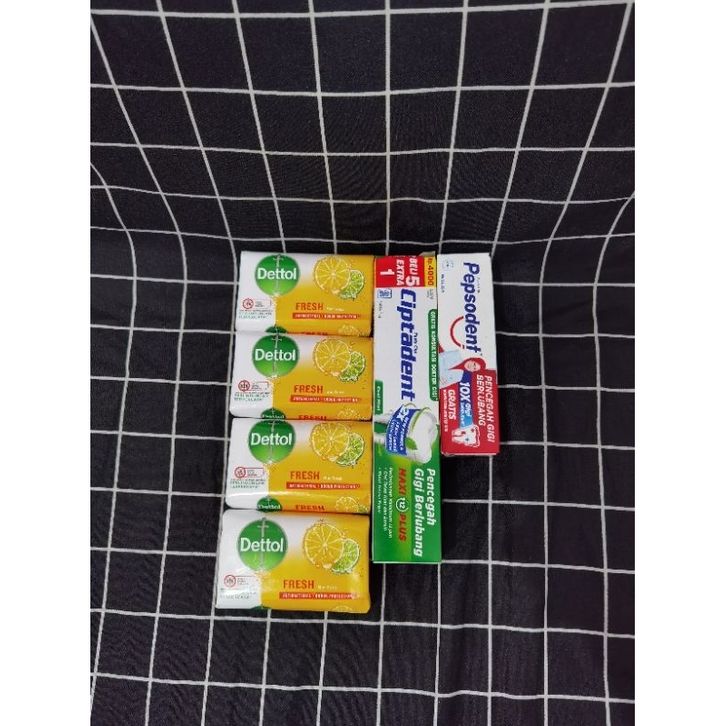 paket sabun dettol 4pcs dan pasta gi ciptadent 75gr dan pepsodent 25gr
