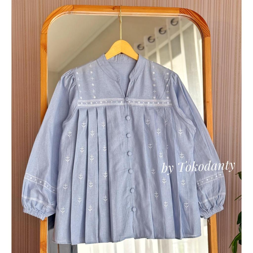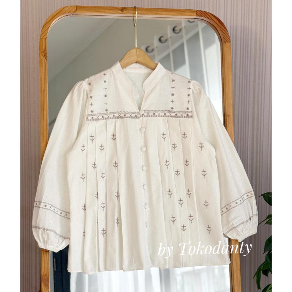 Tifana Blouse Linen Rami Atasan Kemeja Adem Bordir
