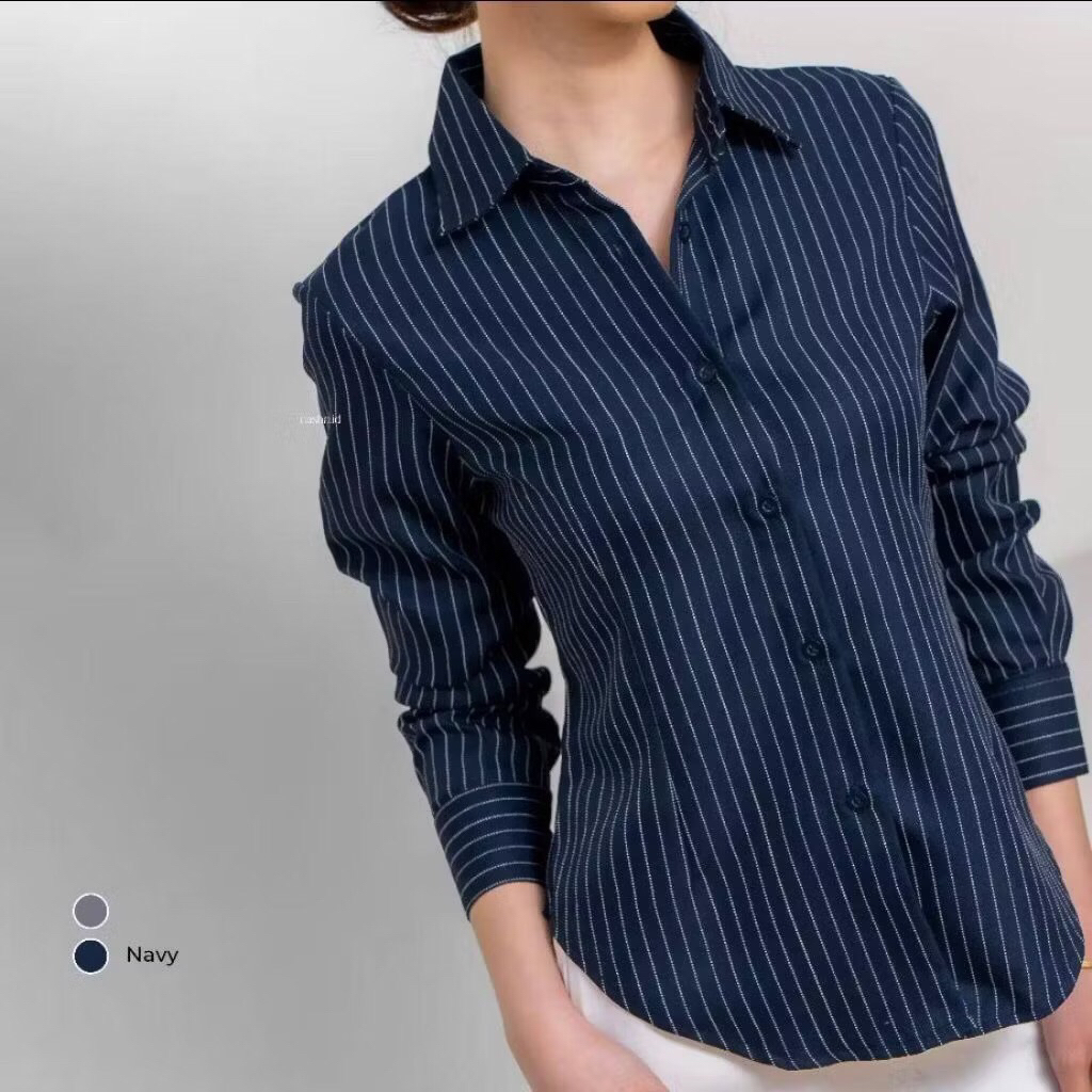 Kemeja Atasan Wanita Motif Salur Garis Stripe Slim Fit Body – Lengan Flare Elegan, Kekinian Feminim
