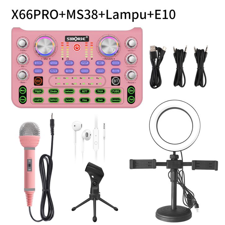 Siborie X66PRO soundcard pink MS38 mic Ring light E10 headset Paket Komplit sound card bluetooth mixer