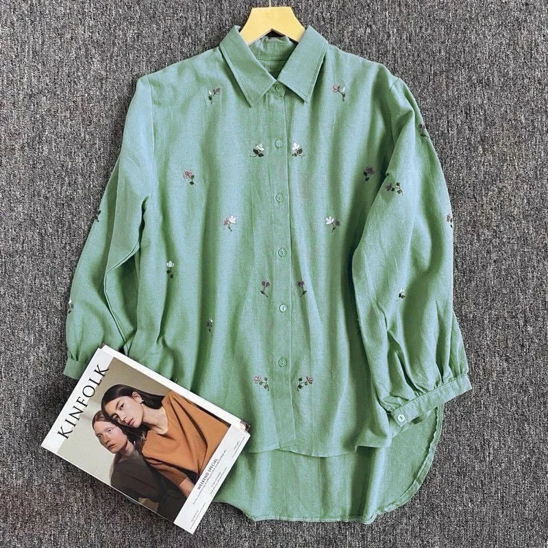 Kemeja Wanita Pololinen Bordir Bunga - Atasan Casual Lengan Panjang Adem Busui Friendly