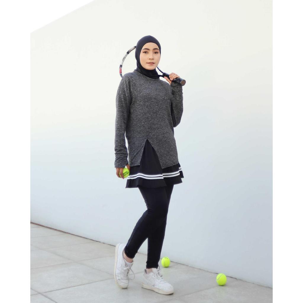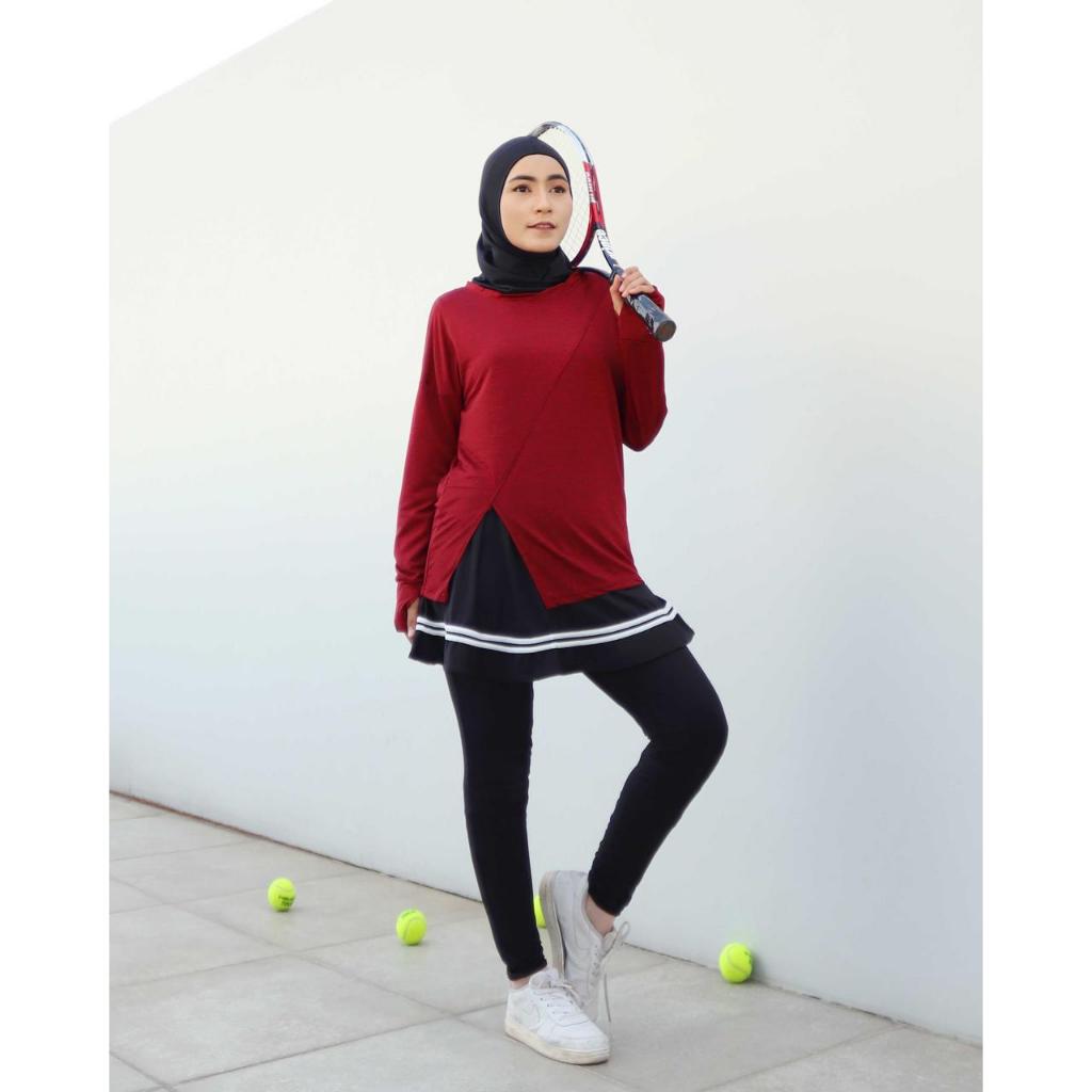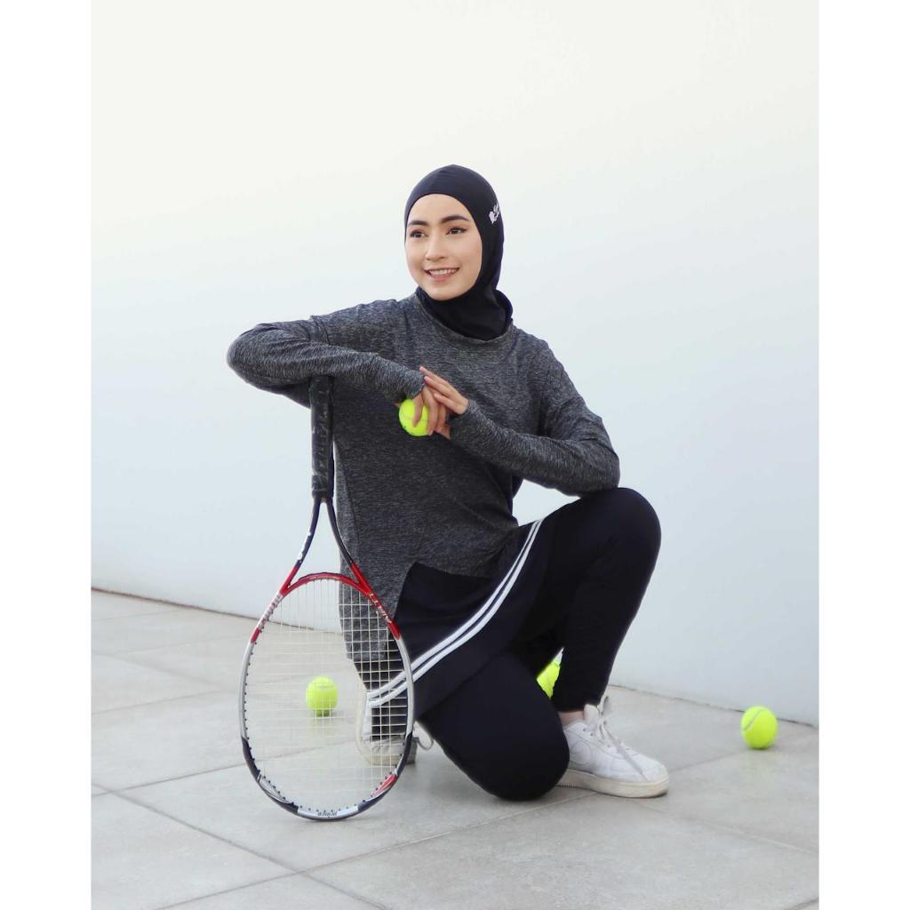 Baju Olahraga Wanita Muslimah Lengan Panjang Long Sleeve Slit Top Tennis Gym Yoga Padel Pilates Maraton - 0052