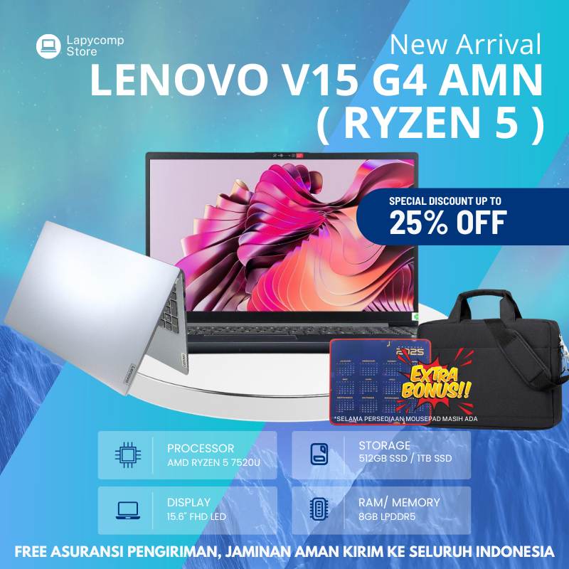 Laptop Gaming Editing Lenovo V15 G4 AMD Ryzen 5-7520U Ram 8GB SSD 512GB / 1TB 15.6" FHD