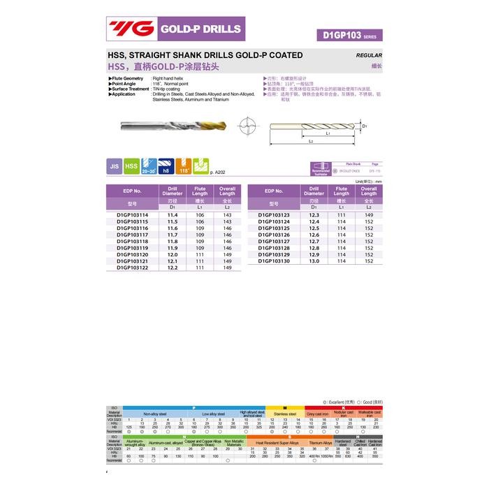Mata Bor 8.0 mm HSS D1GP103 YG-1 Drill Bit Matabor Standar GOLD P Kayu Besi 8 mm