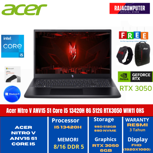 laptop ACER NITRO V 15-51-53WR I5 13420H RTX3050 RAM 8/16GB 512GB W11+OHS 15.6FHD 144HZ resmi