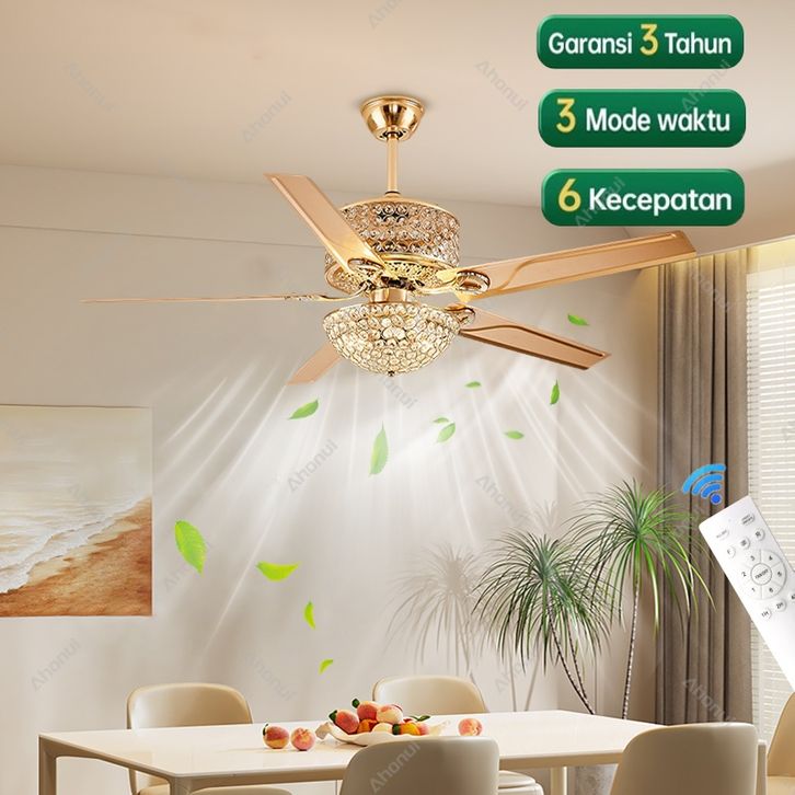 Lampu Kipas Angin Kristal 42/48/52 Inch Remote Control Plafon 2 In1 3 Warna 6 Kecepatan Free Bohlam Tarikan
