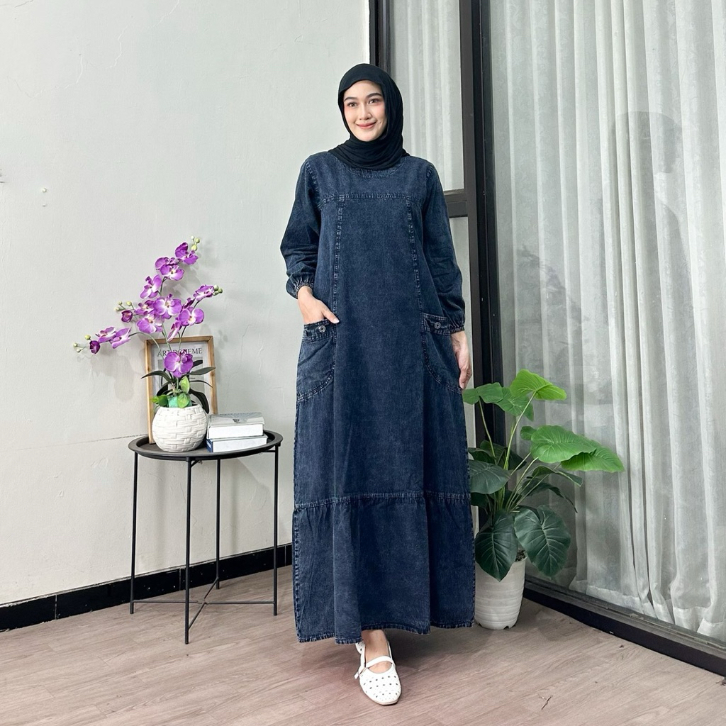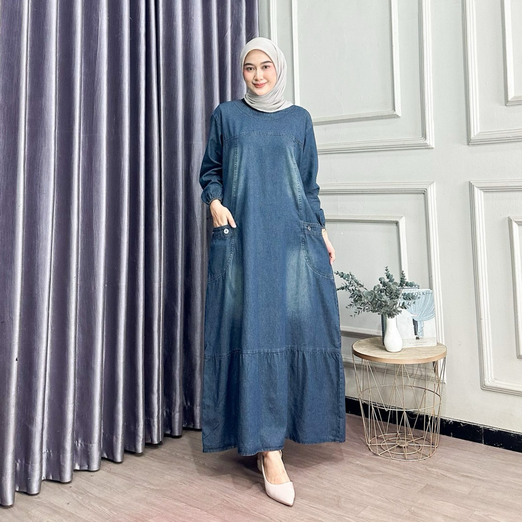 Gamis Susun Jeans Wanita Non Busui Rempel Bawah