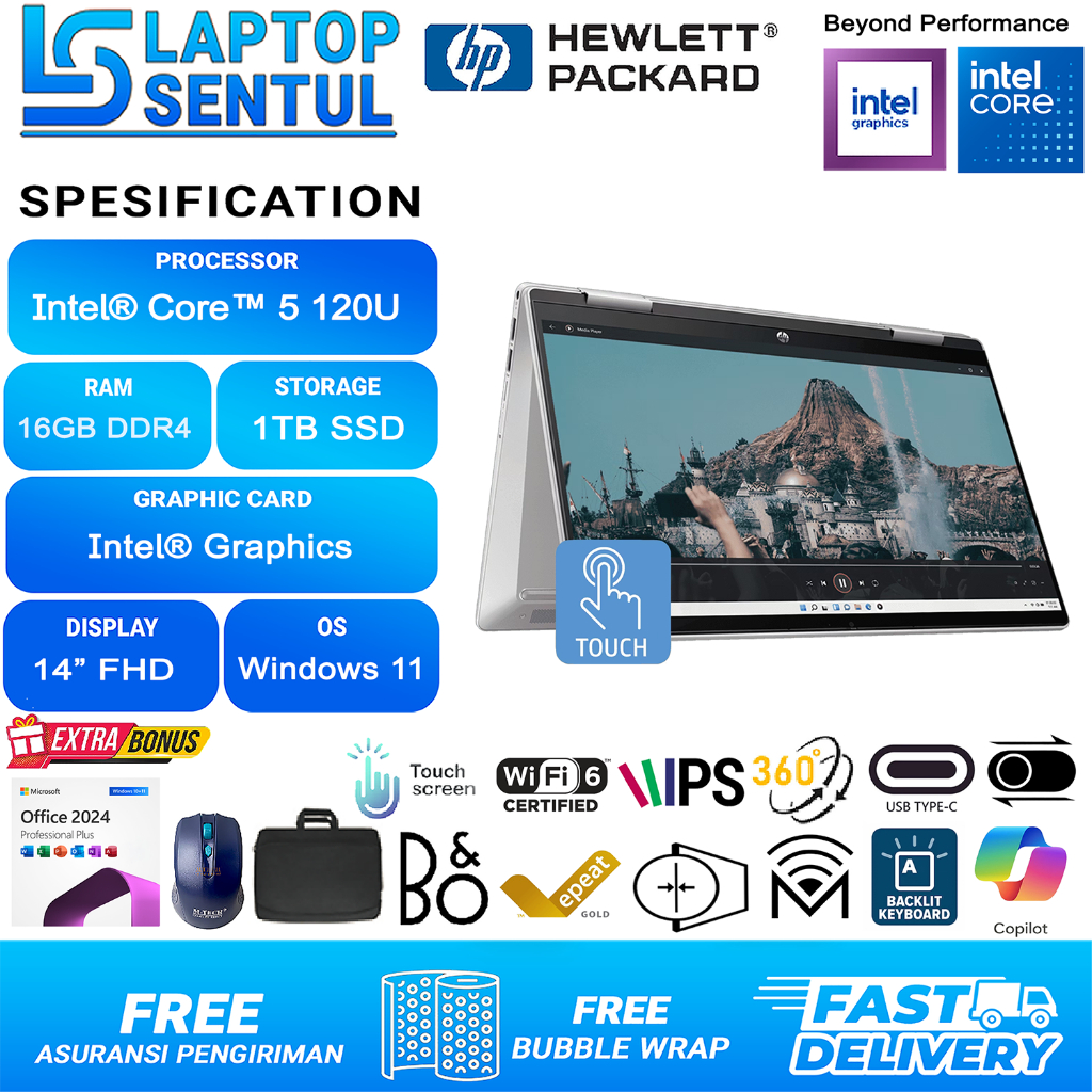 laptop Hp 2in1 Touchscreen Pavilion X360 Intel Core 5 120U Ram 16GB 2TB SSD FHD IPS Windows 11 office 2024 Silver
