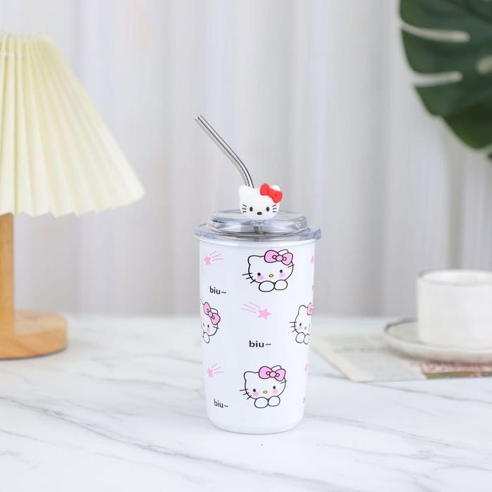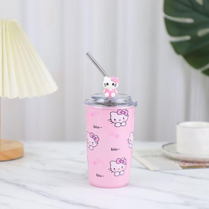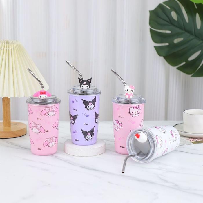 Gelas Tumblr Sanrio Kuromi Melody Cinnamoroll Stainless Steel 450ML dengan Sedotan dan Mainan 3D