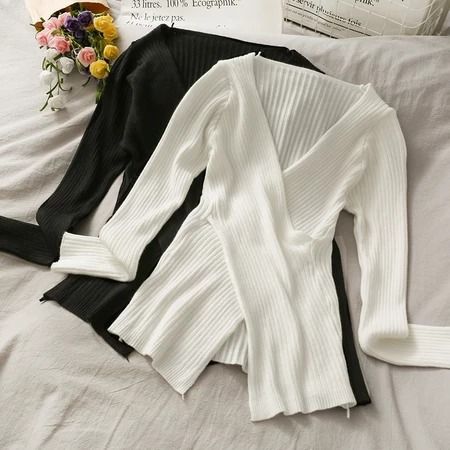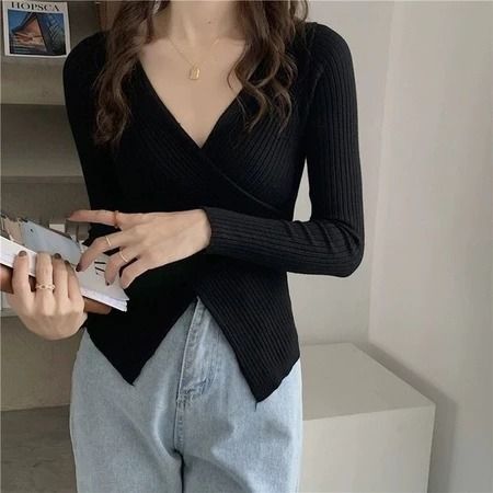 Atasan Rajut Jiso Knit Silang Korean Style Wrap Top V Neck Blouse Atasan Wanita Rajut Press Body Atasan Lengan Panjang
