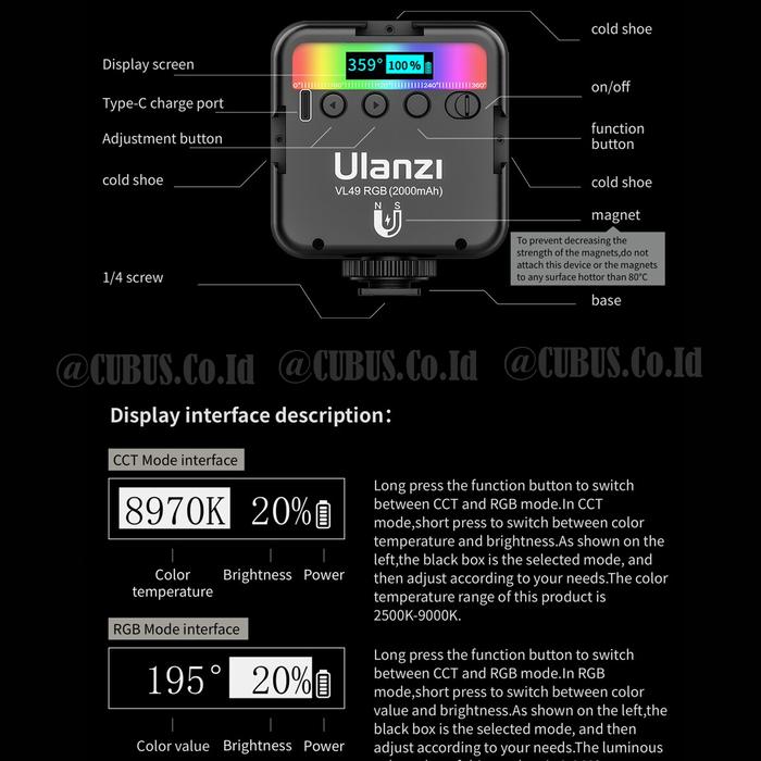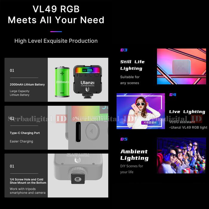ULANZI VL49 RGB LIGHT LED LAMPU PORTABLE MAGNETIC VIDEO PHOTO CAMERA - HITAM