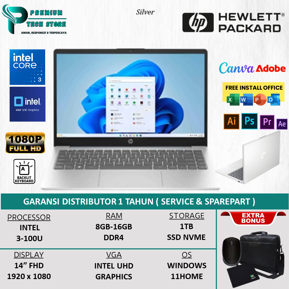 Laptop Baru HP 14s Intel Core 3 100U RAM 16GB SSD 1TB FHD IPS Windows 11 ORIGINAL