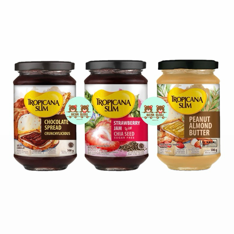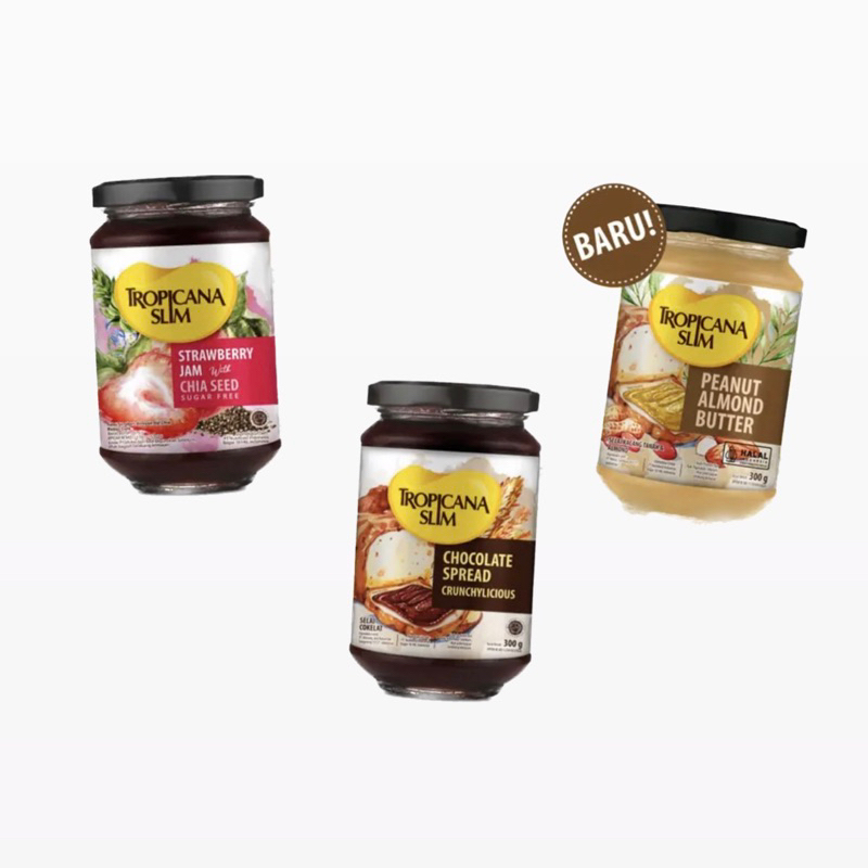 TROPICANA SLIM SELAI 1 JAR CHOCOLATE SPREAD 300GR / PEANUT ALMOND BUTTER 300GR / STRAWBERRY JAM 375GR / ROYAL MATCHA SPREAD 300GR