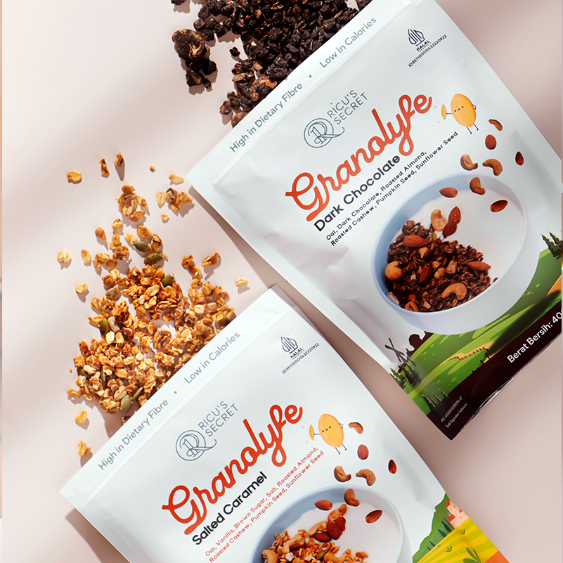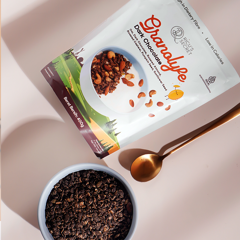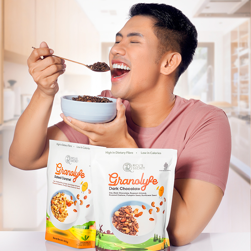 RICU'S SECRET GRANOLYFE - BUNDLING 2 POUCH SEREAL GRANOLA DARK CHOCOLATE & SALTED CARAMEL DENGAN STEVIA (800 GRAM)