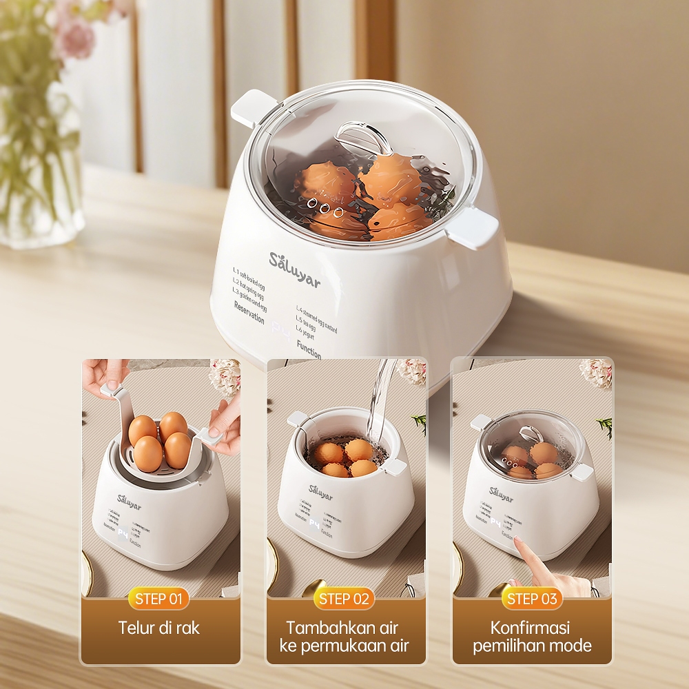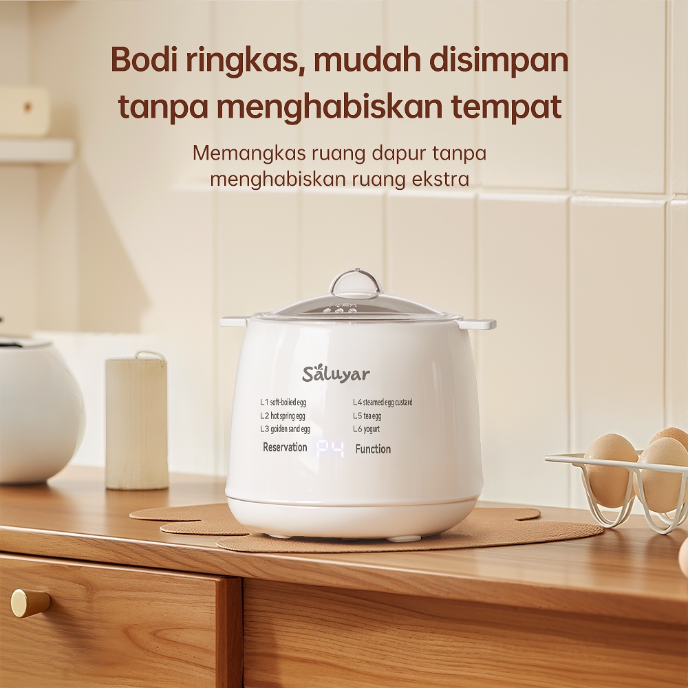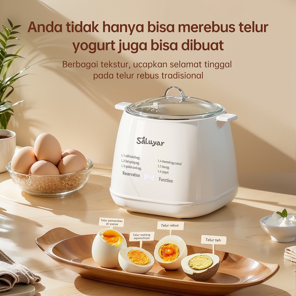 Saluyar Smart Egg Cooker – Mesin Rebus Telur Pintar 4 Butir, Timer AI, Multi Fungsi Yogurt & Puding, Desain Jepang