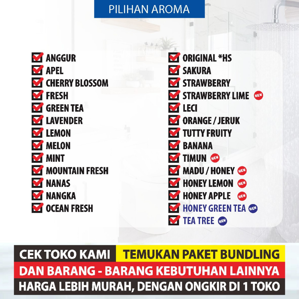 Anggur, Apel, Cherry Blossom, Fresh, Green Tea, Lavender, Lemon, Melon, Mint, Mountain Fresh, Nanas, Nangka, Ocean Fresh, Sakura, Strawberry, Leci, Jeruk, Tutty Fruity, Banana, Anggur + Shower Puff, Apel + Shower Puff, Cherry + Shower Puff, Fresh + Shower Puff, Green Tea + Shower, Lavender + Shower, Lemon + Shower Puff, Melon + Shower Puff, Mint + Shower Puff, Mountain + Shower, Nanas + Shower Puff, Nangka + Shower Puff, Ocean + Shower Puff, Sakura + Shower Puff, Strawberry + Shower, Leci + Shower Puff, Jeruk + Shower Puff, Tutty + Shower, Banana + Shower Puff, Honey, Honey + Shower Puff, Ori Biru/Non Aroma, Ori Biru + Shower, Timun, Timun + Shower Puff, Honey Apple, Honey Apple + Shower, Honey Lemon, Hney Lemon + Shower, Honey Greentea, Hney Grntea + Shower, Tea Tree, Tea Tree + Shower