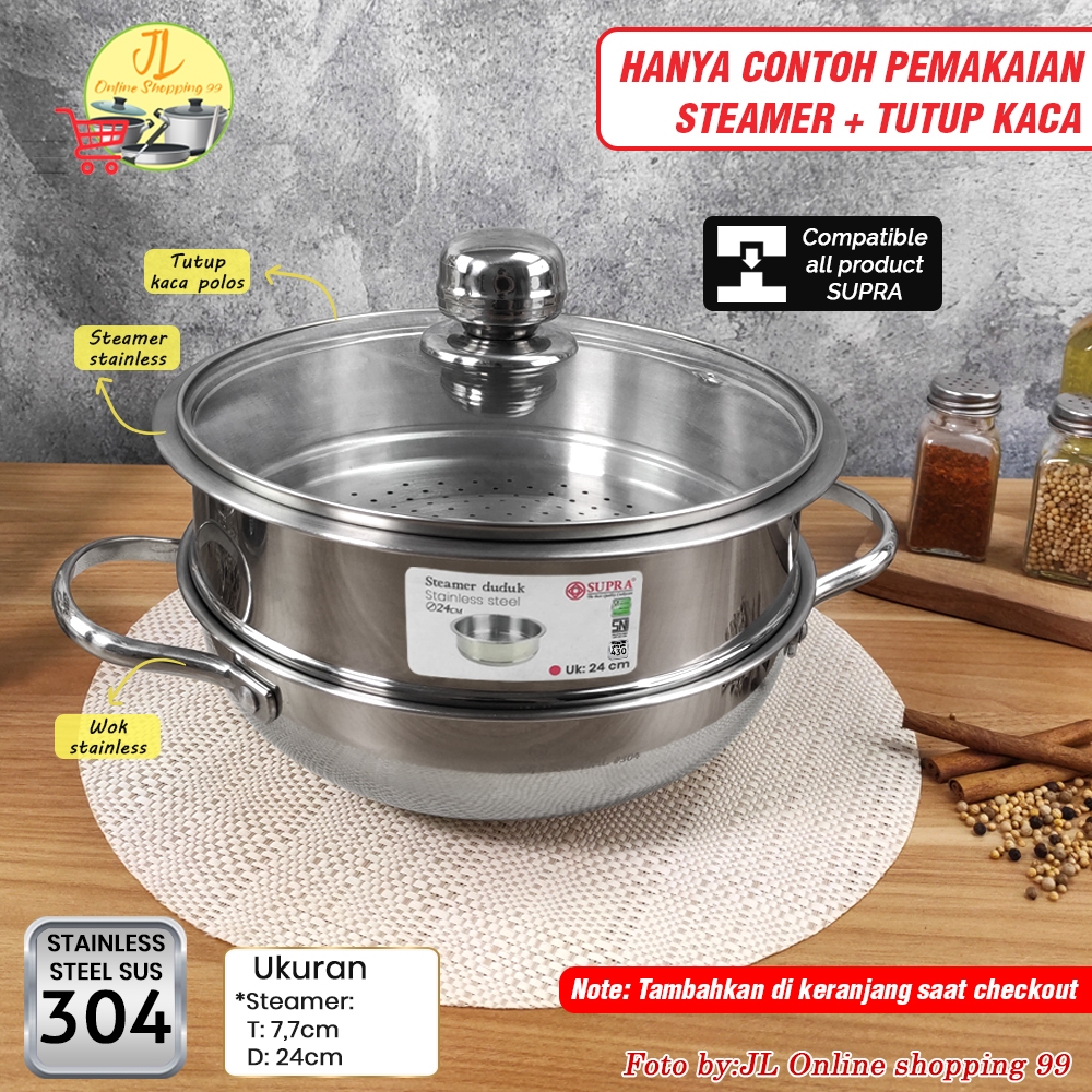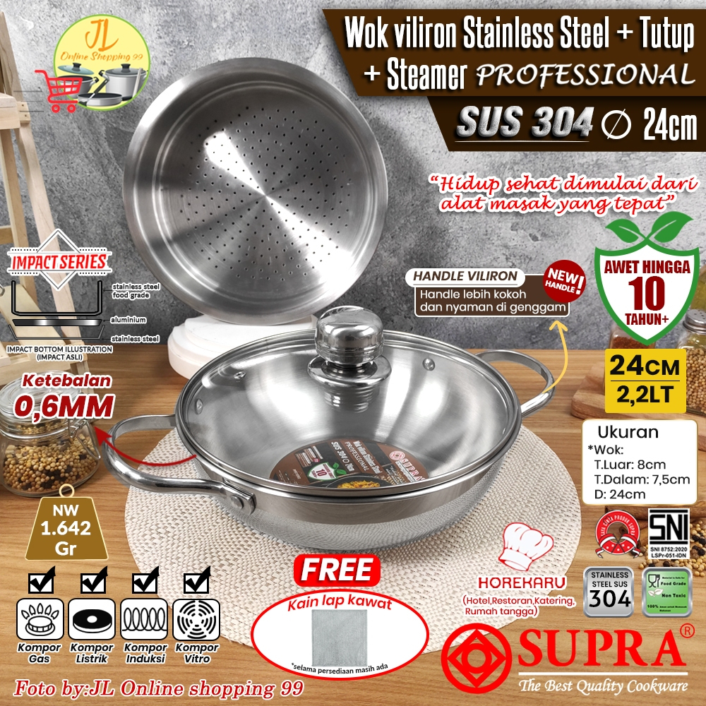 SUPRA wok 24cm + steamer + tutup stainless steel impact SUS 304 professional series / panci wajan penggorengan handle ku
