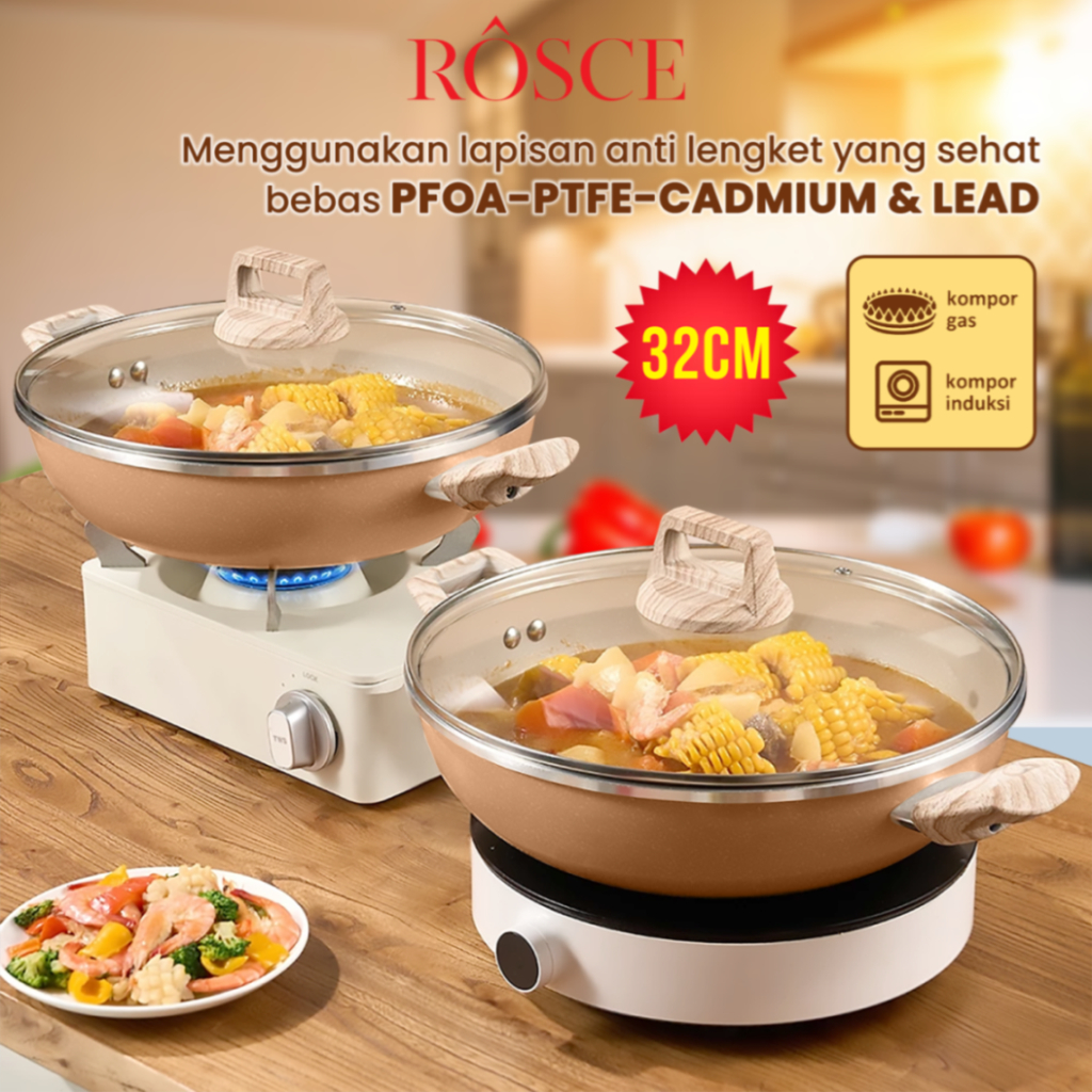 ROSCE WOK PAN 32CM Steamer Wajan set kukusan stainless jumbo Panci granit marble tutup kaca 32 cm