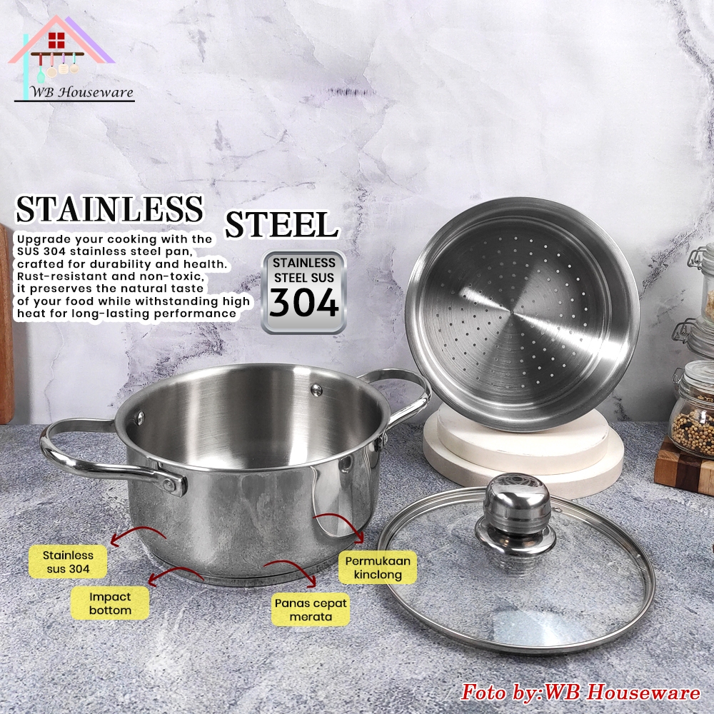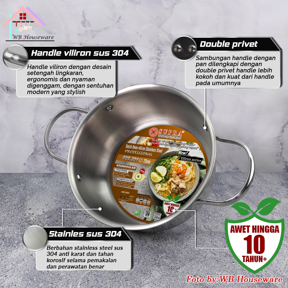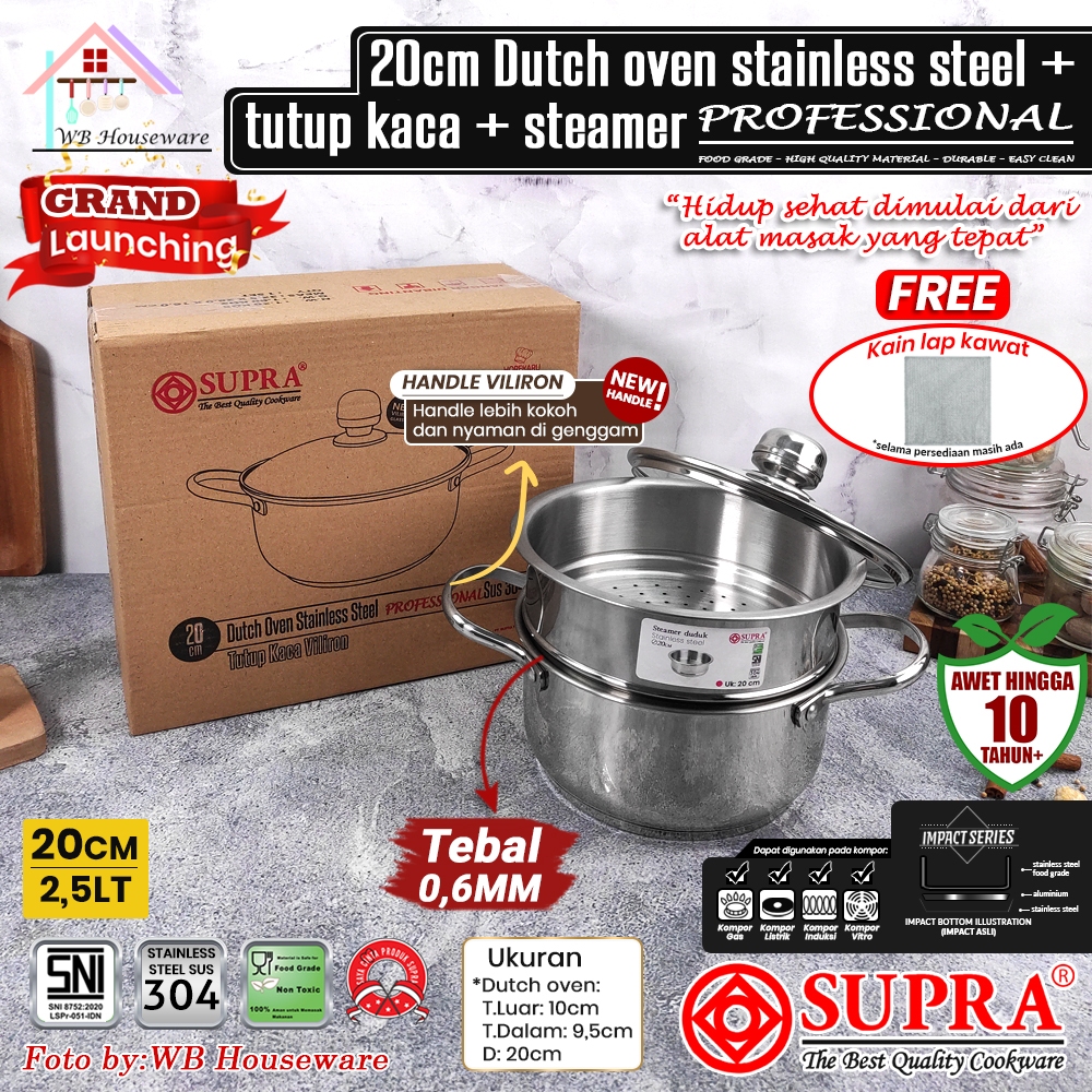 SUPRA Dutch Oven 20cm Stainless Steel SUS 304 + steamer + Tutup Kaca Professional series impact bottom / panci masak mie