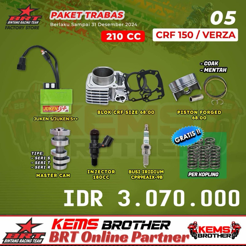 PAKET ORIGINAL BRT CRF150/VERZA TRABAS 5 BOREUP 210CC (ECU JUKEN 5 DUALBAND, SILINDER BLOK CASTING IRON 68, PISTON KIT,