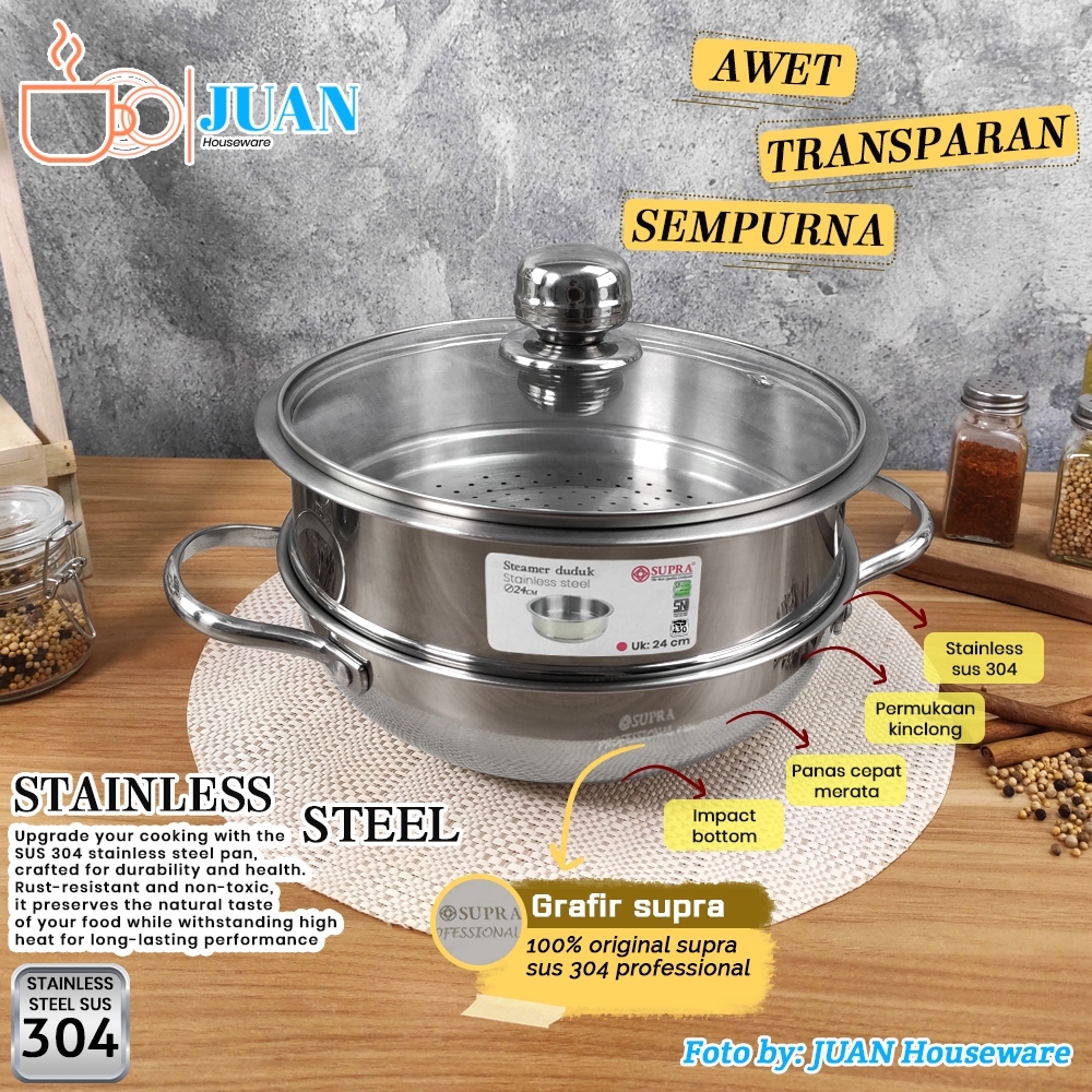 SUPRA Wajan stainless steel 24cm sus 304 professional + steamer + tutup kaca viliron knob stainless