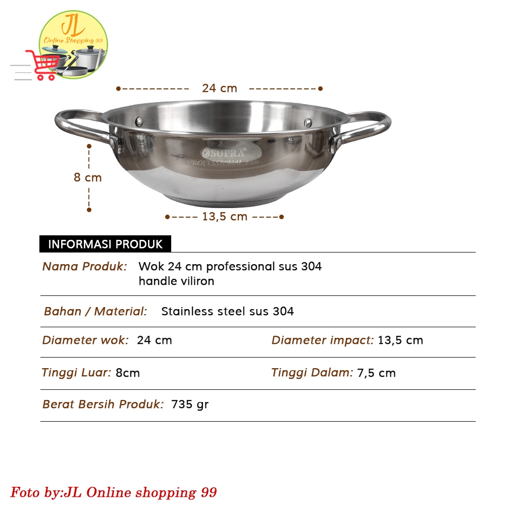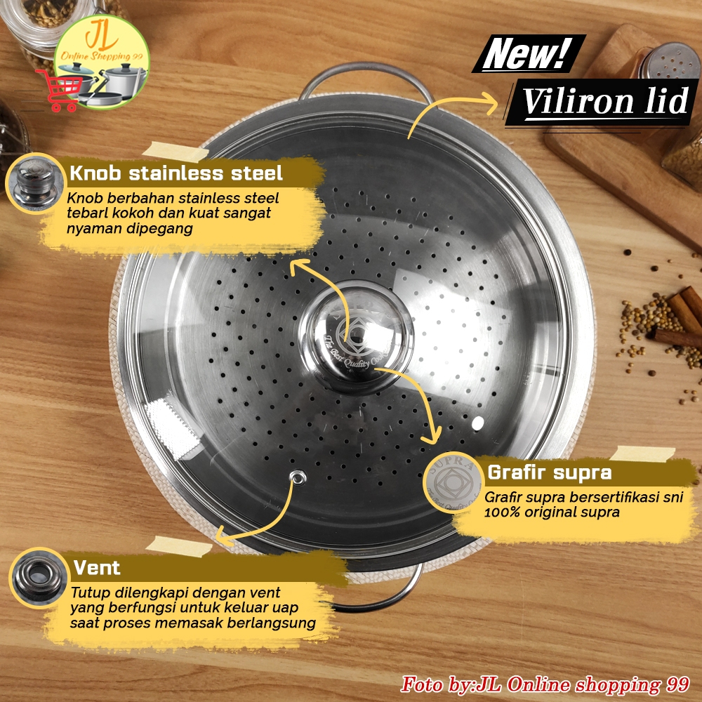 SUPRA wok 24cm + steamer + tutup stainless steel impact SUS 304 professional series / panci wajan penggorengan handle ku