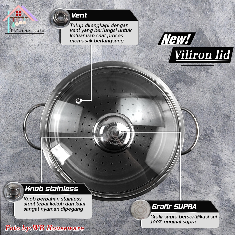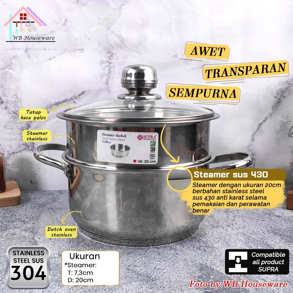 SUPRA Dutch Oven 20cm Stainless Steel SUS 304 + steamer + Tutup Kaca Professional series impact bottom / panci masak mie
