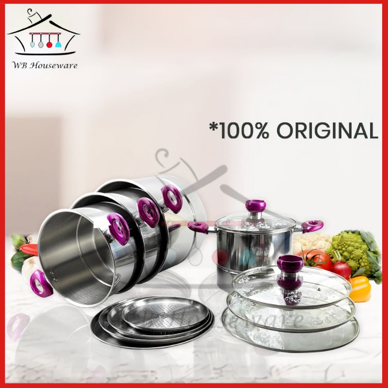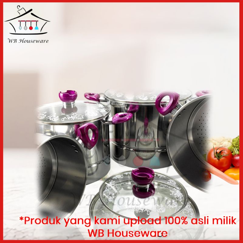 panci set pengukus 4in1 / kukusan / steamer tutup kaca motif renda SUPRA ungu