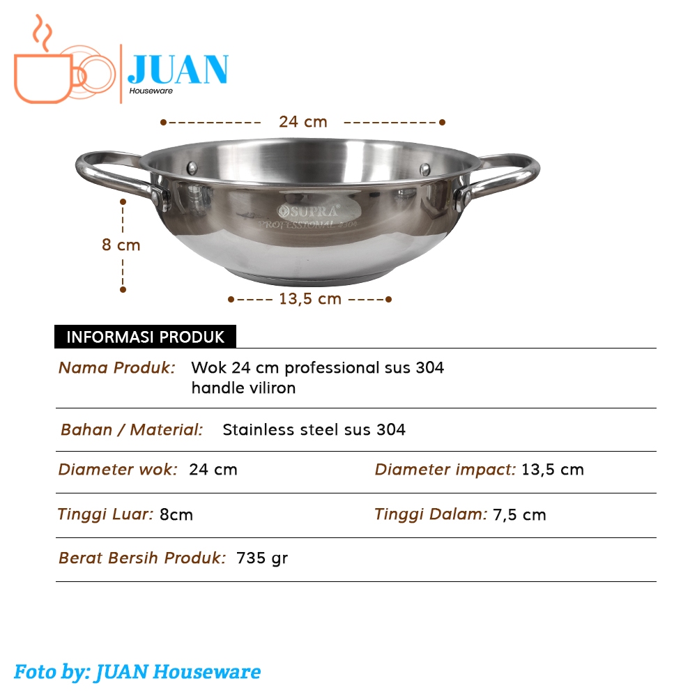 SUPRA Wajan stainless steel 24cm sus 304 professional + steamer + tutup kaca viliron knob stainless