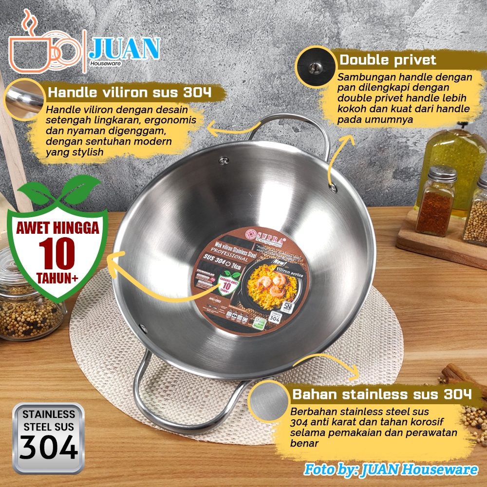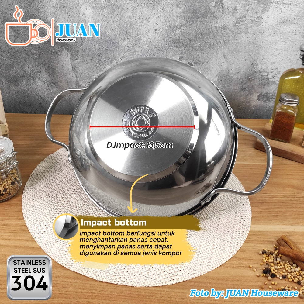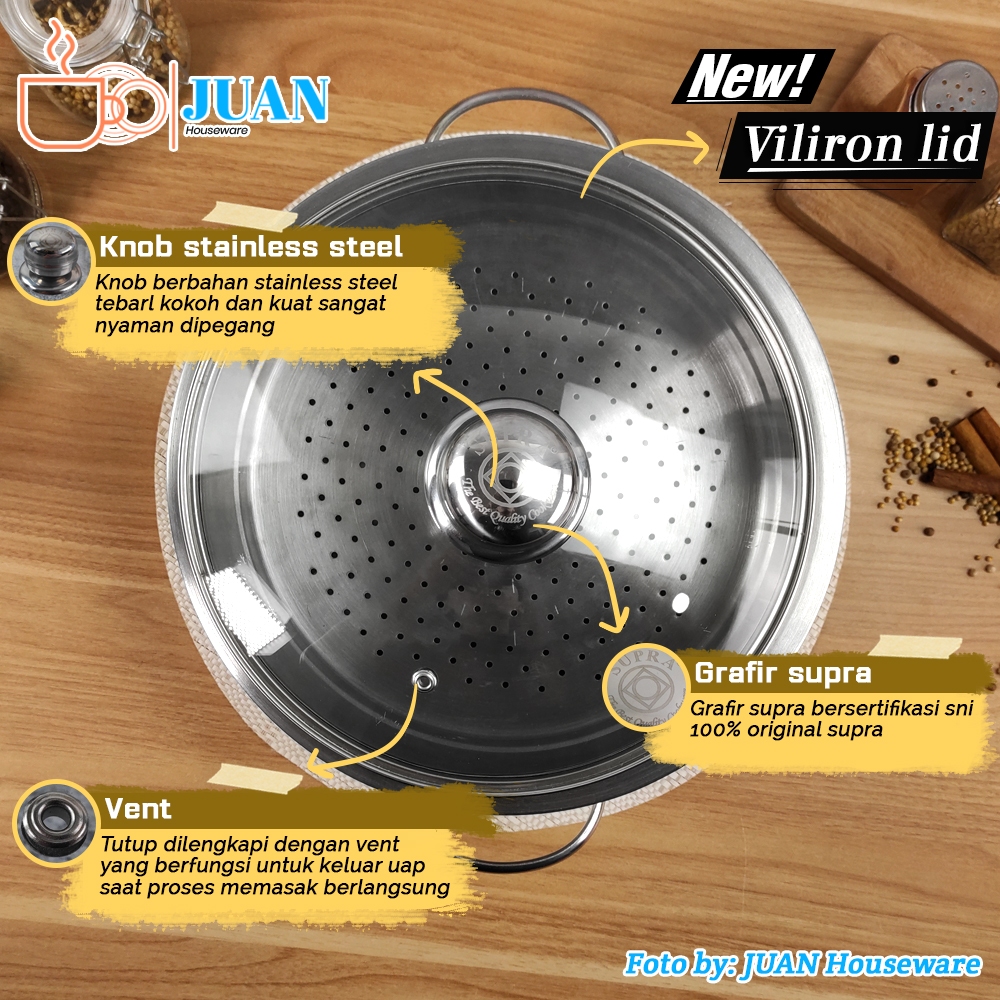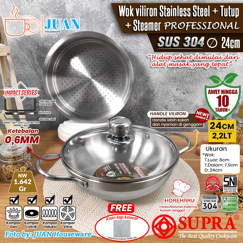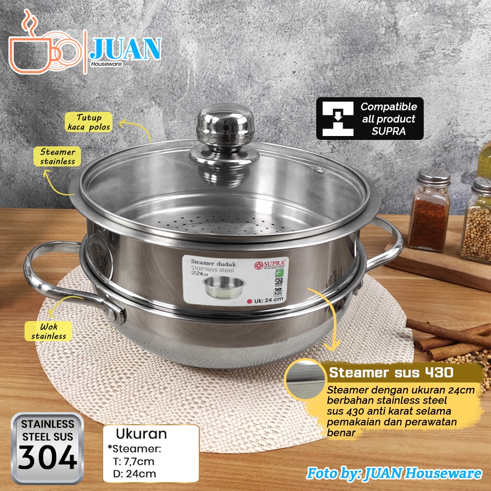 SUPRA Wajan stainless steel 24cm sus 304 professional + steamer + tutup kaca viliron knob stainless