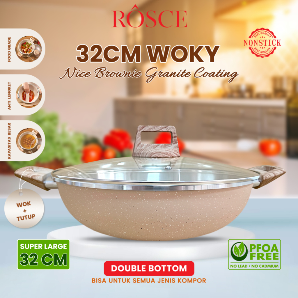 ROSCE WOK PAN 32CM Steamer Wajan set kukusan stainless jumbo Panci granit marble tutup kaca 32 cm