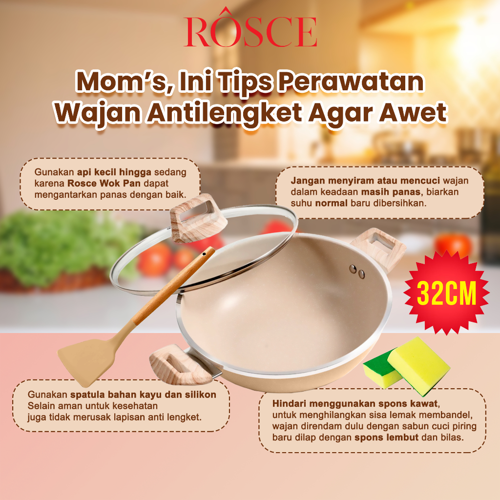 ROSCE WOK PAN 32CM Steamer Wajan set kukusan stainless jumbo Panci granit marble tutup kaca 32 cm