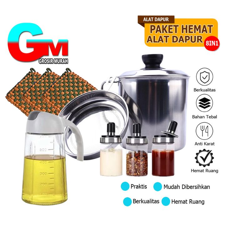 NEW PAKET HEMAT 8IN1 Oil Pot Stainless 1L Dispenser Minyak 630ml Tempat bumbu Kain Lap Cempal ucakl