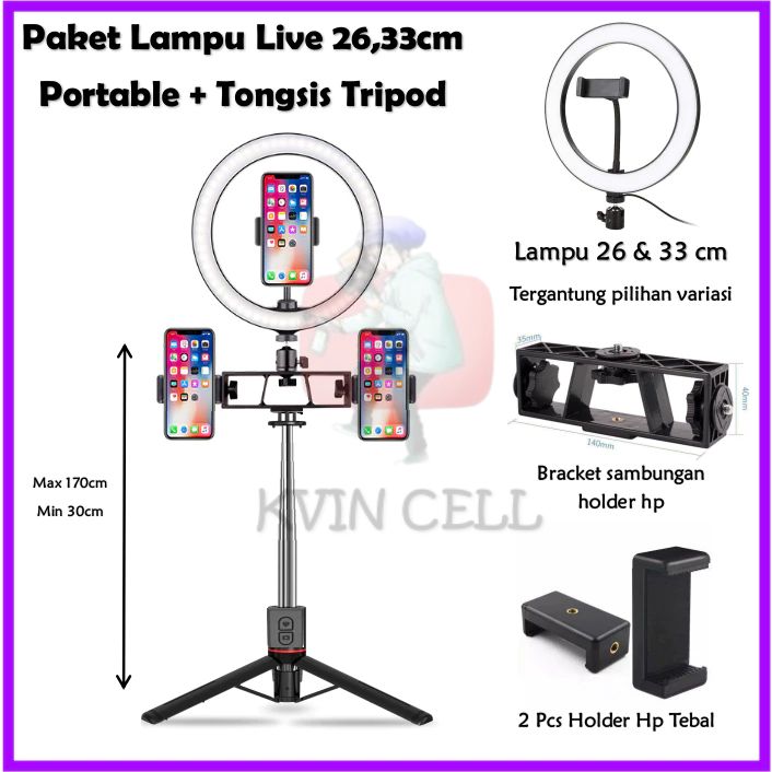 Paket Lampu Ring Light 26cm 33cm Live dan TriP00D Tongsis 1,7 Meter Free 3 Holder Hp Live Studio Streaming Striming Jua