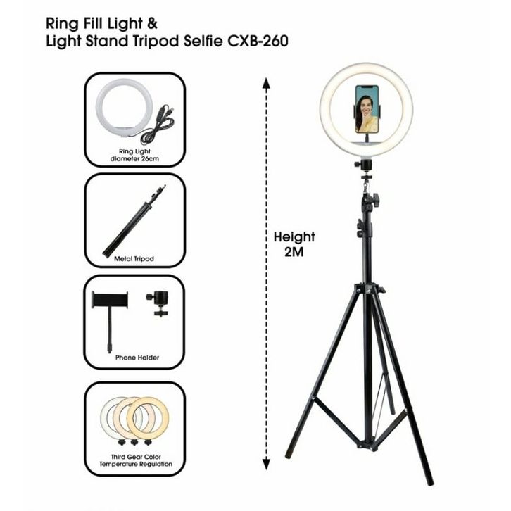 PAKET KOMPLIT RINGLIGHT 26CM + TRIP00D 2,1 METER MAKE UP VLOG LAMPU RINGLIGHT