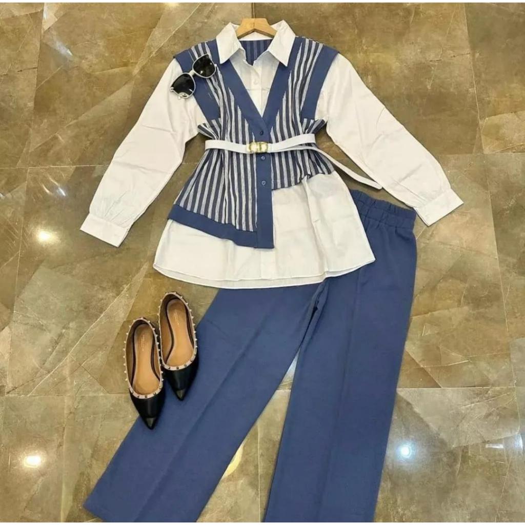 FLASH Dena One Set pakaian Wanita Bahan CRINGKLE Setelan 2 In 1 FREE BELT Kekinian Terbaru Atasan Dan Celana Wanita